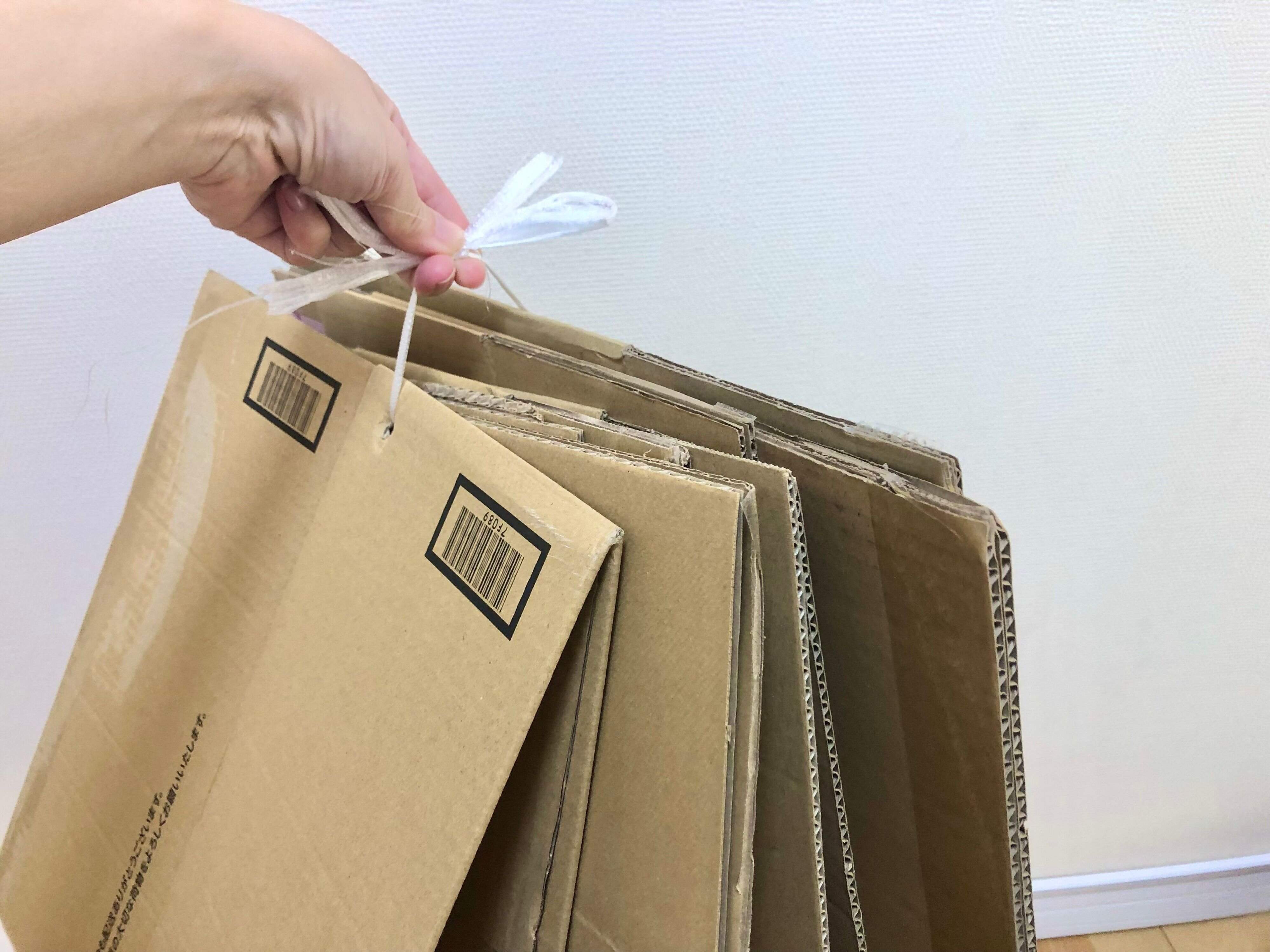 一般的には段ボールを紐でまとめるのって、まず段ボールをまとめやすいようにサイズごとに重ねて、ぐるぐると段ボールに紐を巻いたり、紐を縛ったりと意外と面倒…。
