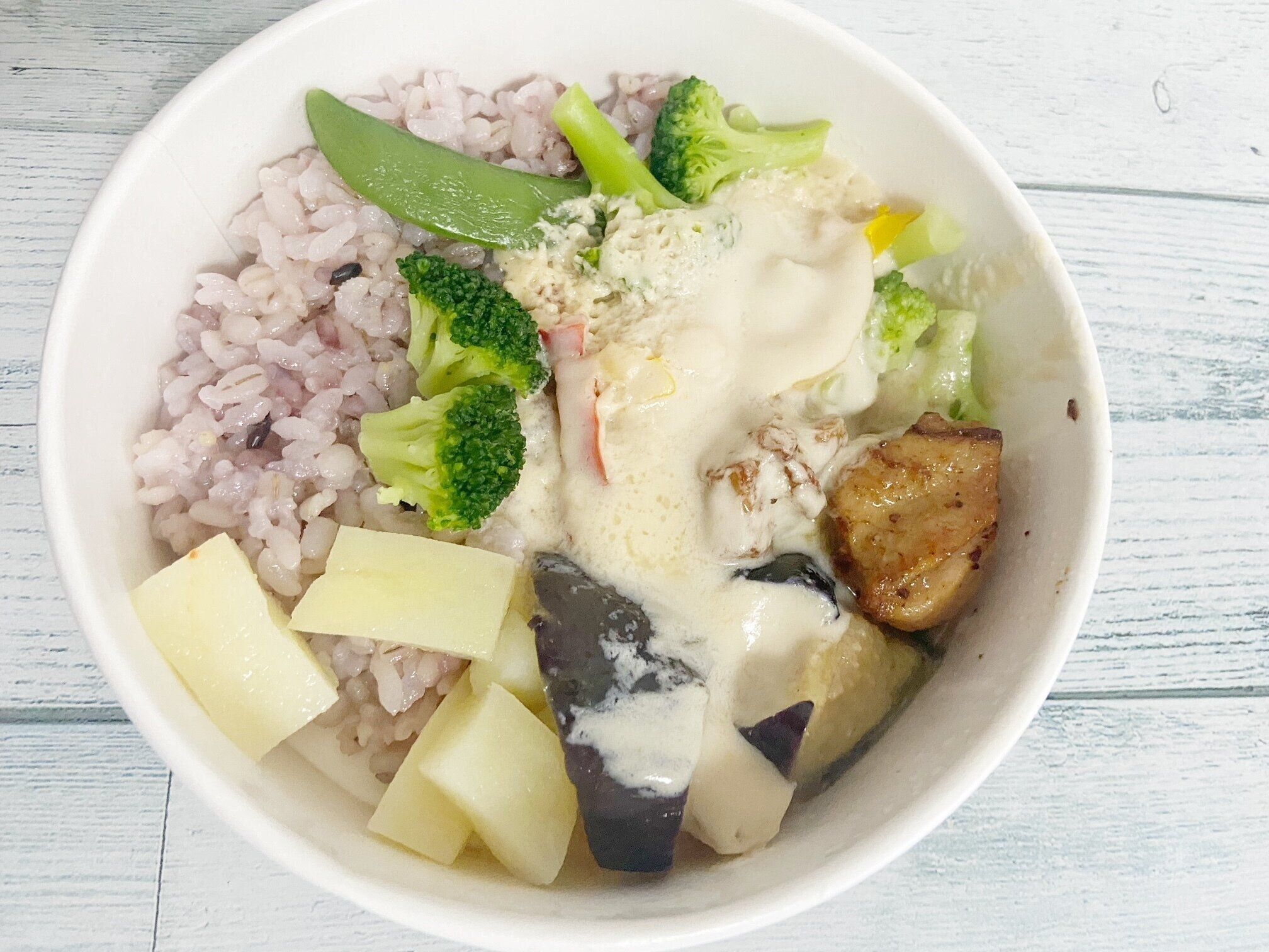 「トップバリュ 雑穀米と食べるサラダボウル セサミソース」(537円)は、セサミソースと相性のいいチキンでたんぱく質を摂取できるサラダボウル。ほかにも茄子、じゃがいも、ブロッコリー、ピーマン、スナップえんどうなどのたくさんの野菜が入っています。