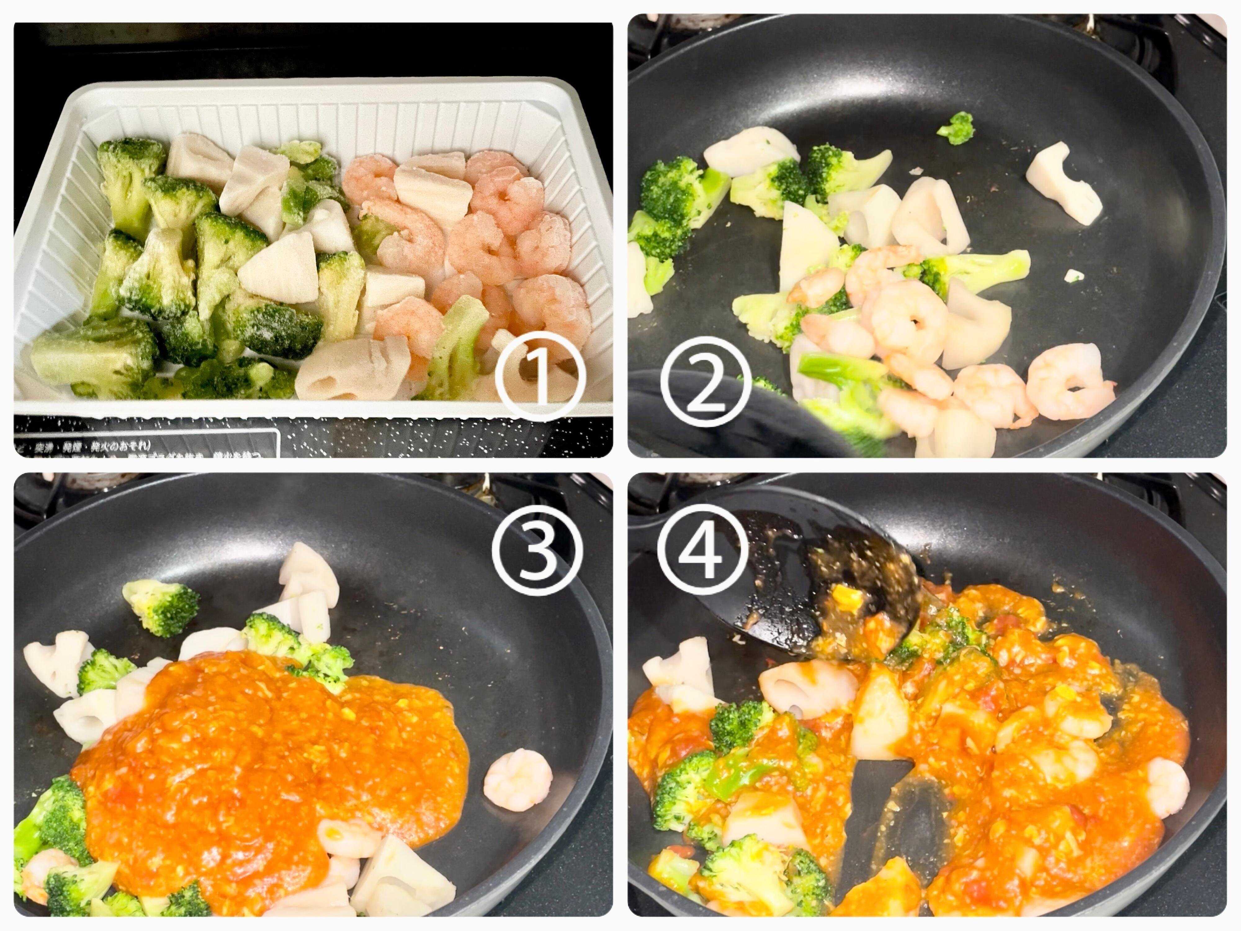(2)エビだけをを取り出す。れんこんとブロッコリーを中火にかけたフライパンで1分強炒める。
