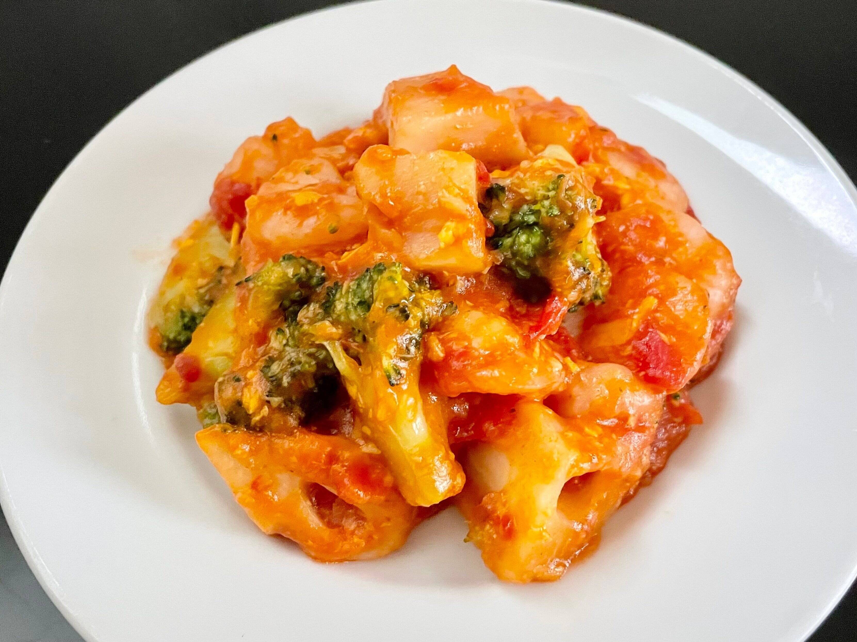 袋の中にはブロッコリー、れんこん、エビが入っているトレーと調味液が2袋入っています。