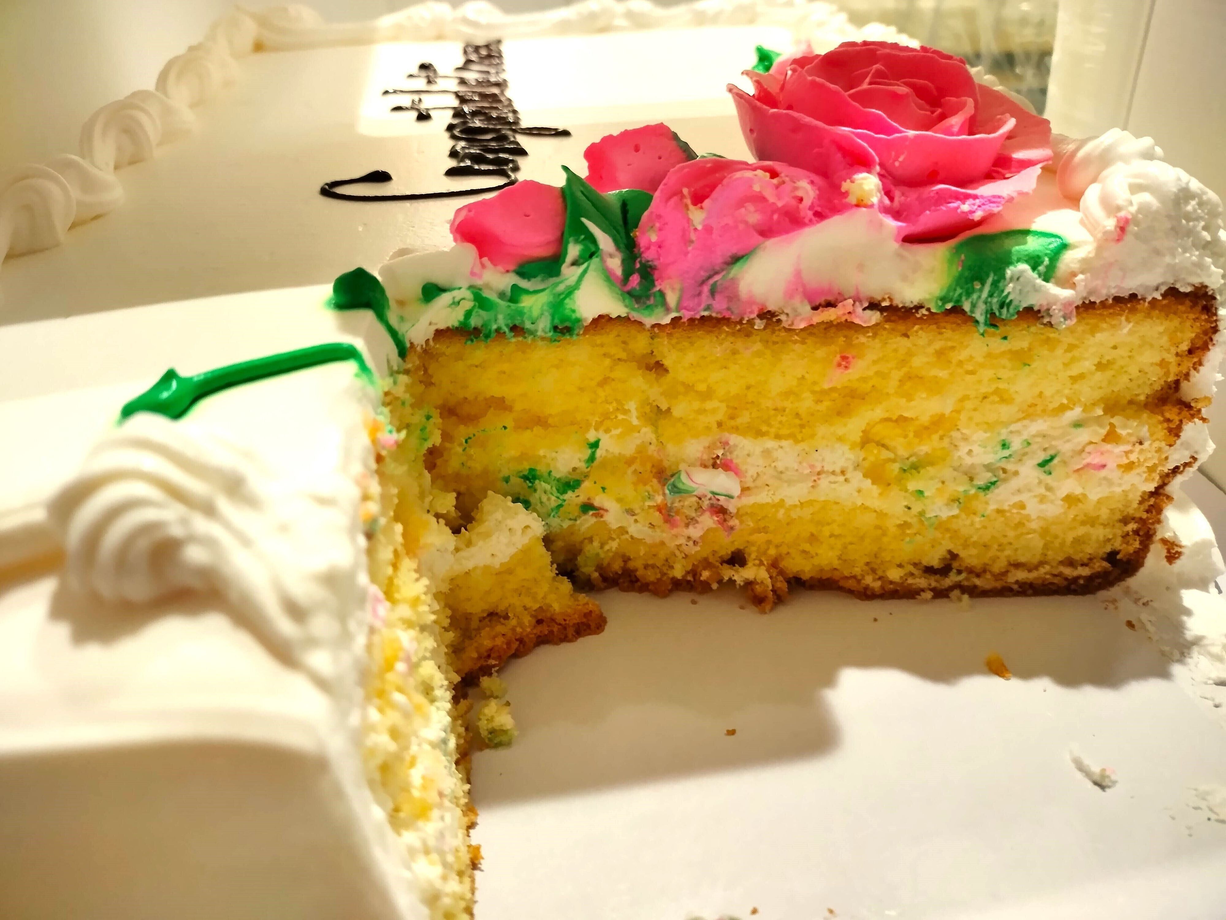 以前のハーフシートケーキは、スポンジが結構しっかりしていて、どちらかというとカステラのような印象だったのですが、このクォーターシートケーキになってからはふわふわのスポンジになっていました。一般的なお誕生日ケーキに近くなったように感じます。