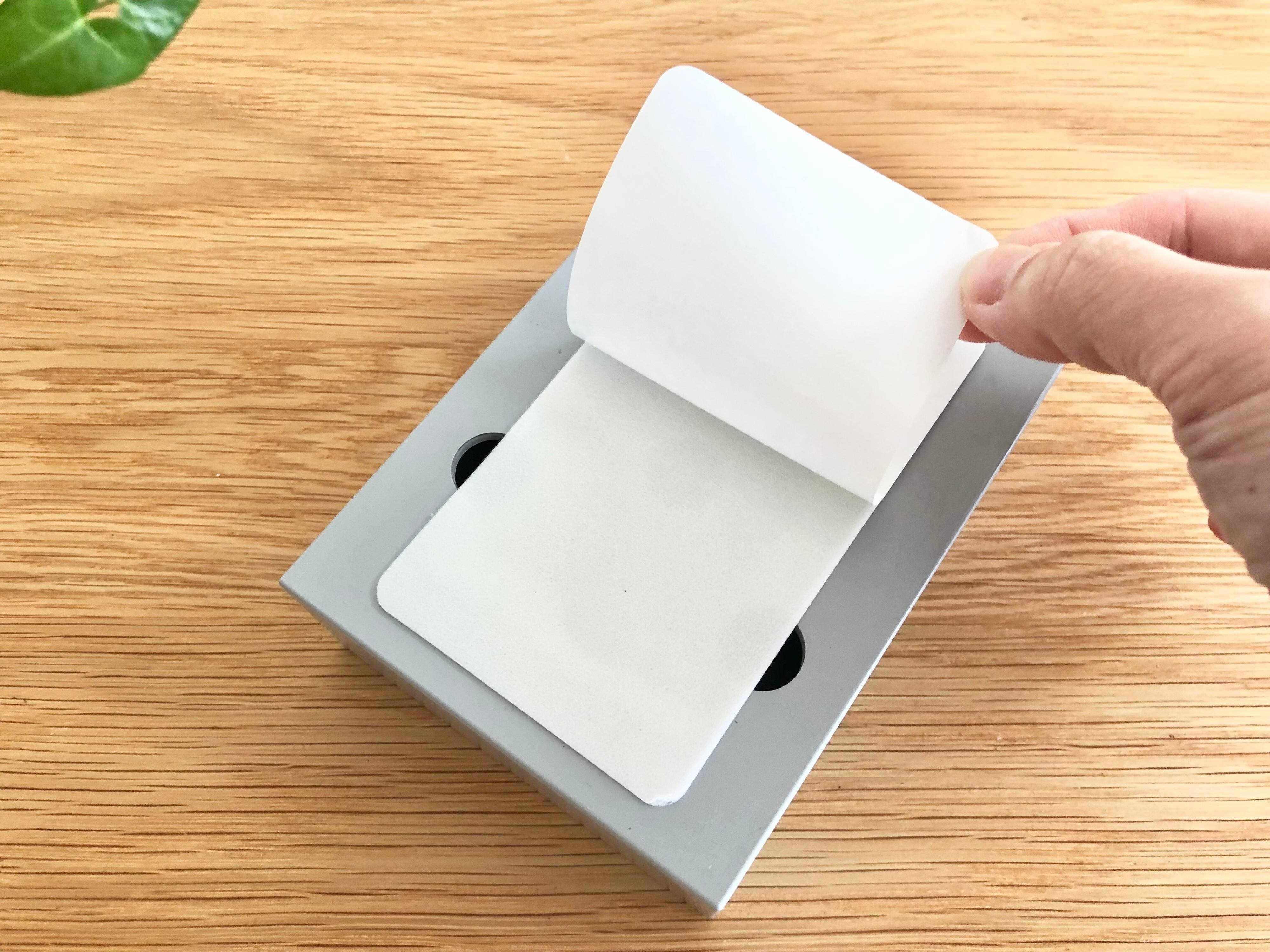 最初に、商品の裏側の粘着テープの剥離紙を剥がします。