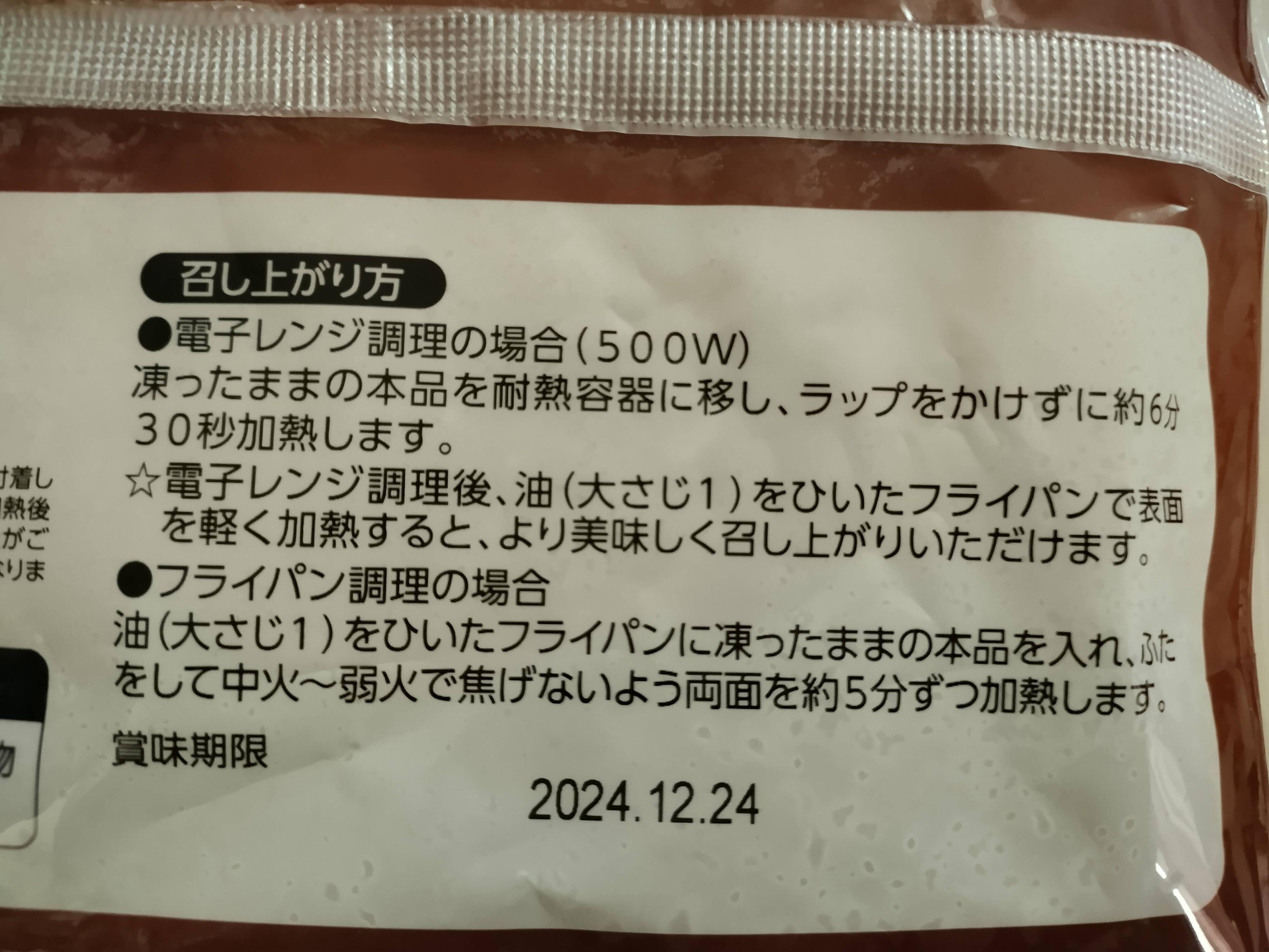 電子レンジ調理の場合は、500Wで6分30秒温めるそうです。電子レンジ調理だけでも食べられますが、そのあとにフライパンでさっと焼くとよりおいしくなるそうですよ。