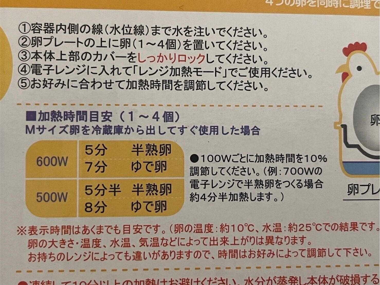加熱時間の目安は600Wで半熟卵をつくるなら5分、ゆで卵をつくるなら7分加熱します。