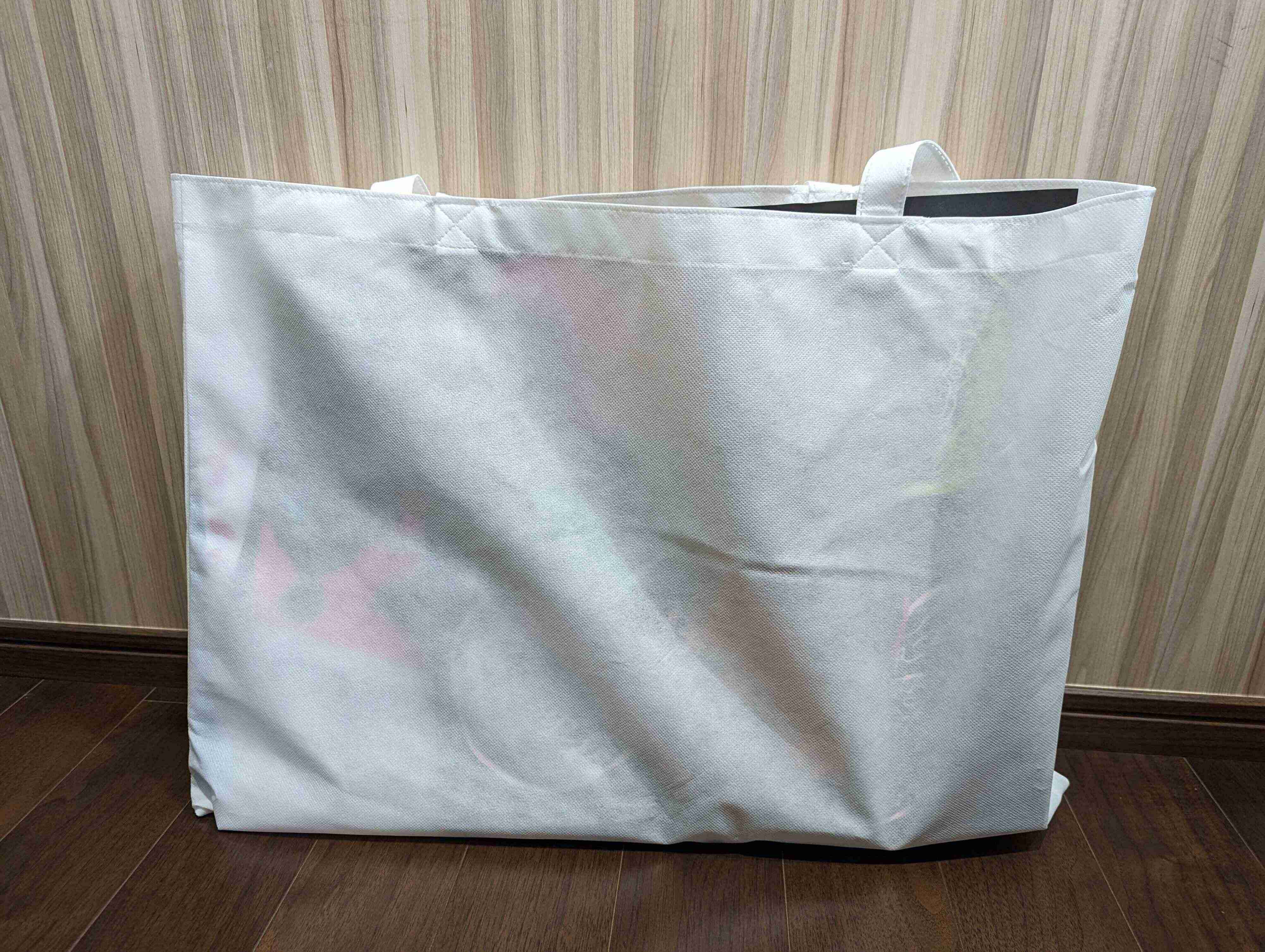 ひとまとめにした作品は、マチなしの不織布バッグに入れて子ども部屋のクローゼット上段へ。これに入れておけば、絵が折れたり、作品に使ったクレヨンでまわりを汚したりする心配がなくなります。