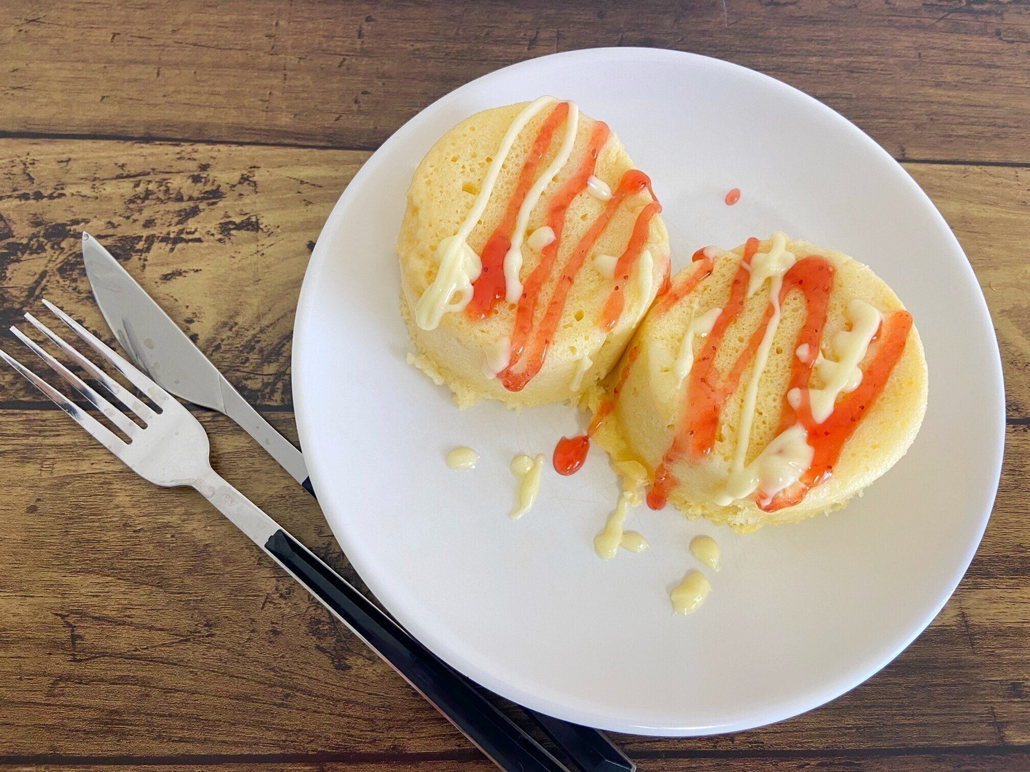 パンケーキメーカーから取り外したふんわりパンケーキは電子レンジ調理なので焼き目はありません。食感はふわっとした蒸しパンに近い印象。1枚でも結構お腹いっぱいになりました。