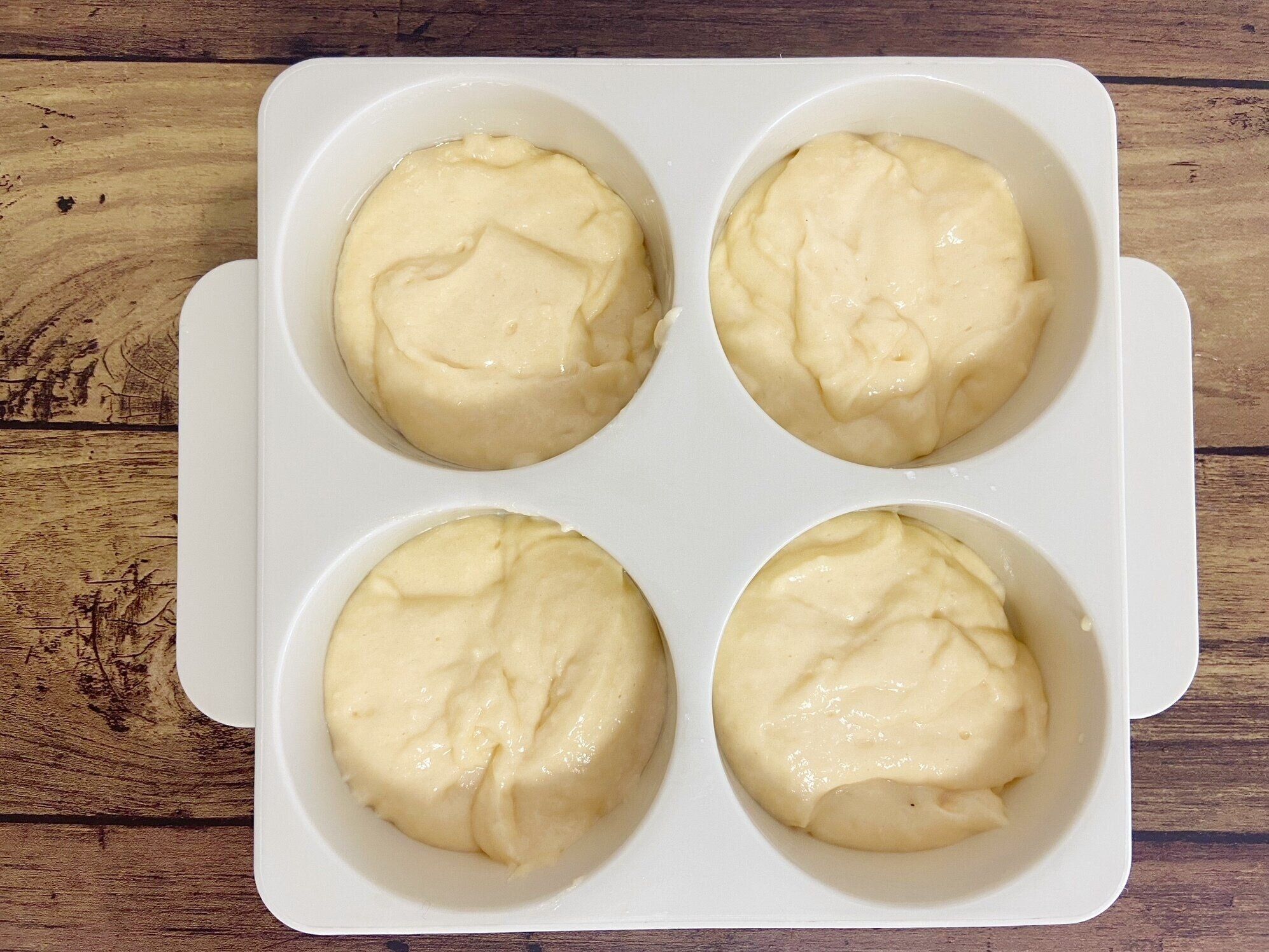 パンケーキのタネは1スペースに大さじ2ほどでOK。筆者はうっかりタネを入れすぎたので加熱している際、パンケーキが想像以上に膨れ上がって仕切りからはみ出てしまいました。入れすぎないように気を付けてください。