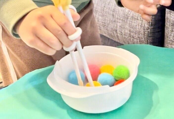 わが家でよくやる遊びは箸を使って色と数を指定されたボールを集めるゲームです。遊びながら集中力やこまかい動作能力を養えますよ。