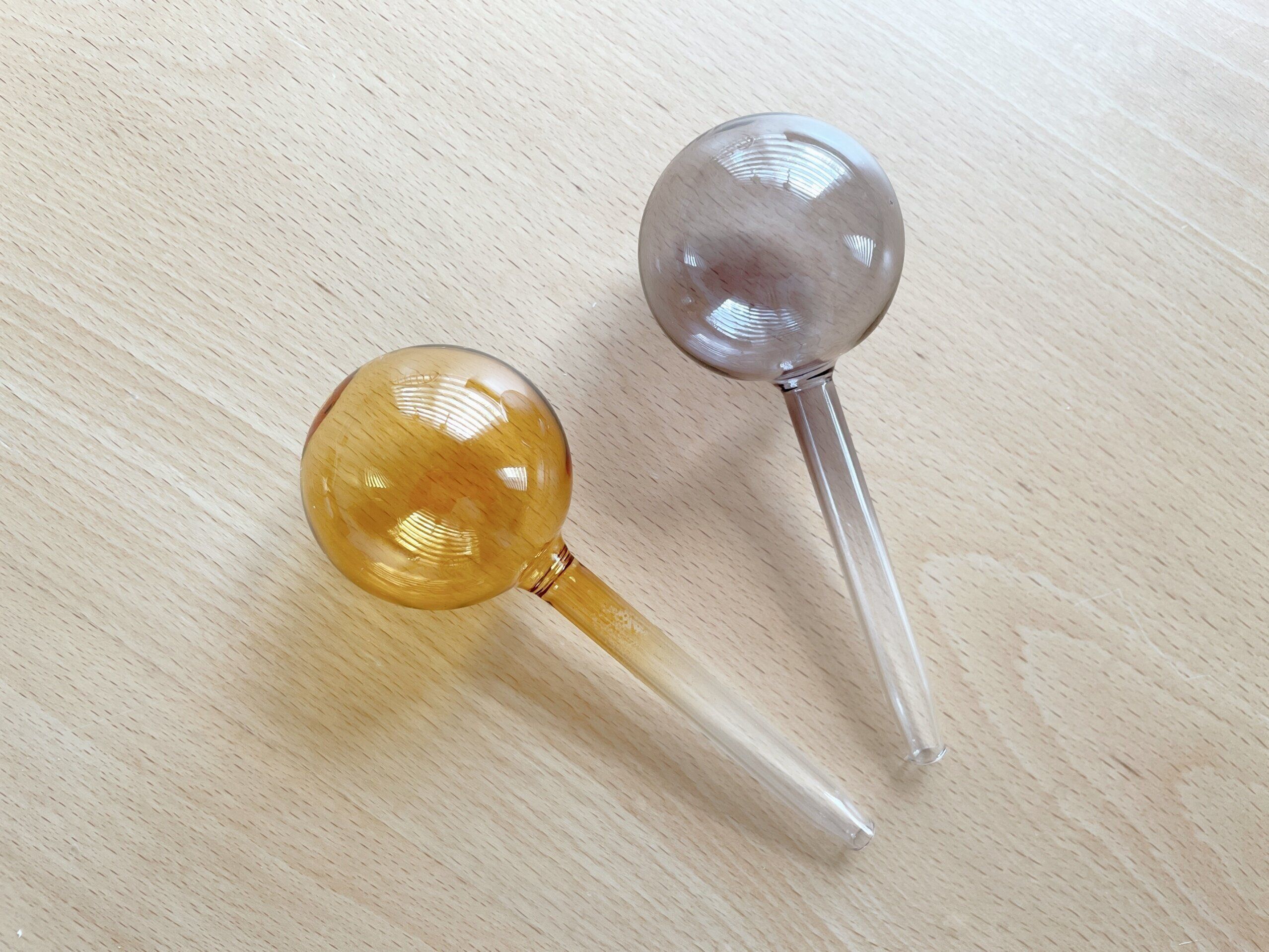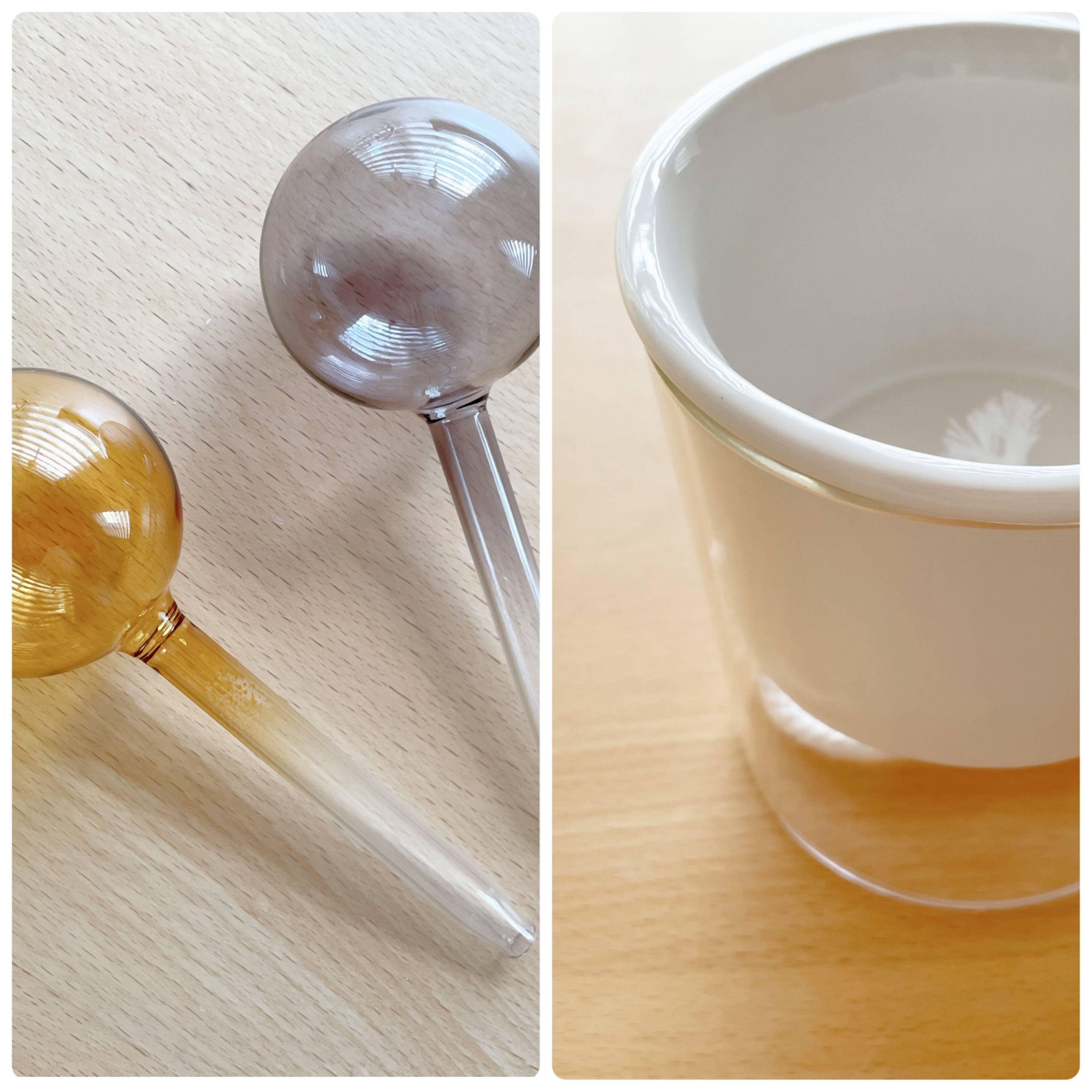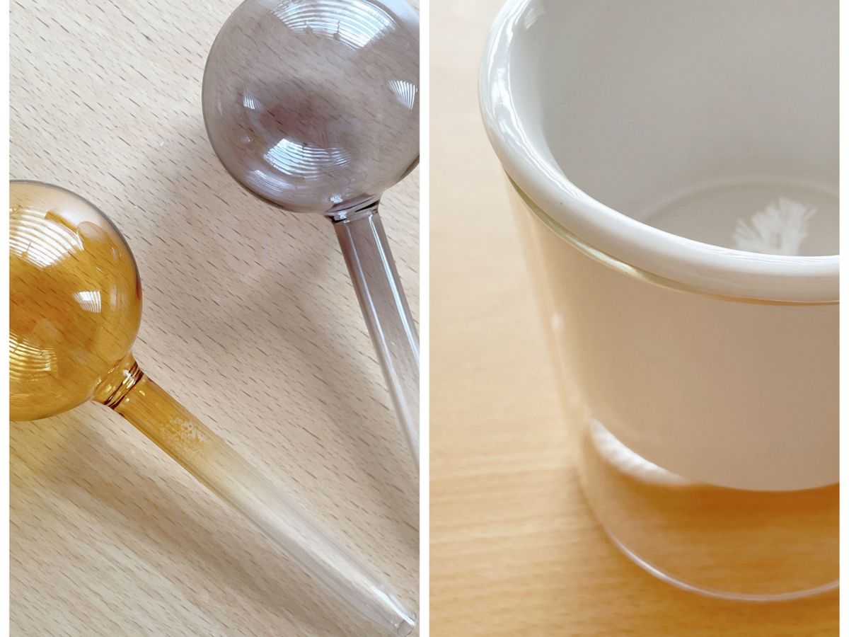かわいいガラス工芸品、ビードロに見えるこちらは「ウォーターディスペンサー(330円)」。カラーはイエロー、チャコールグレー、ブラウンの3色があります。自動給水できるアイテムで水やりを楽にしてくれます。使い方は簡単で、先っぽから水を入れて観葉植物の土部分に差し込むだけ。