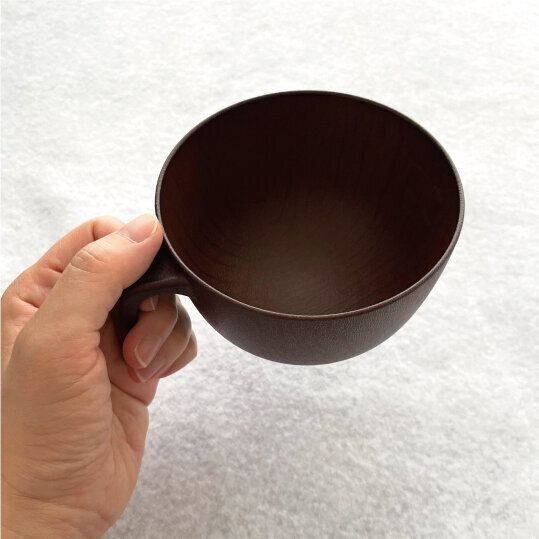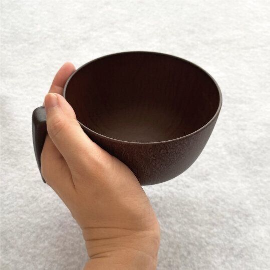 持ち手が特徴的な木風仕上げの汁椀です。使ってみると、便利なポイントがいくつもあり「買ってよかった」と大満足できるアイテムです。