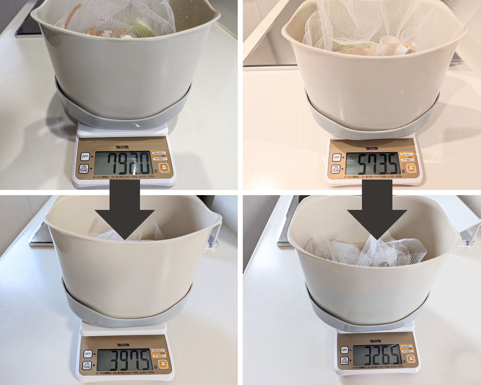 生ごみの種類や状態によって差は出るものの、乾燥後はおよそ半分の重さになりました。かさもグッと減るからごみが軽くてコンパクトになり、ごみ出しがとってもラクに。