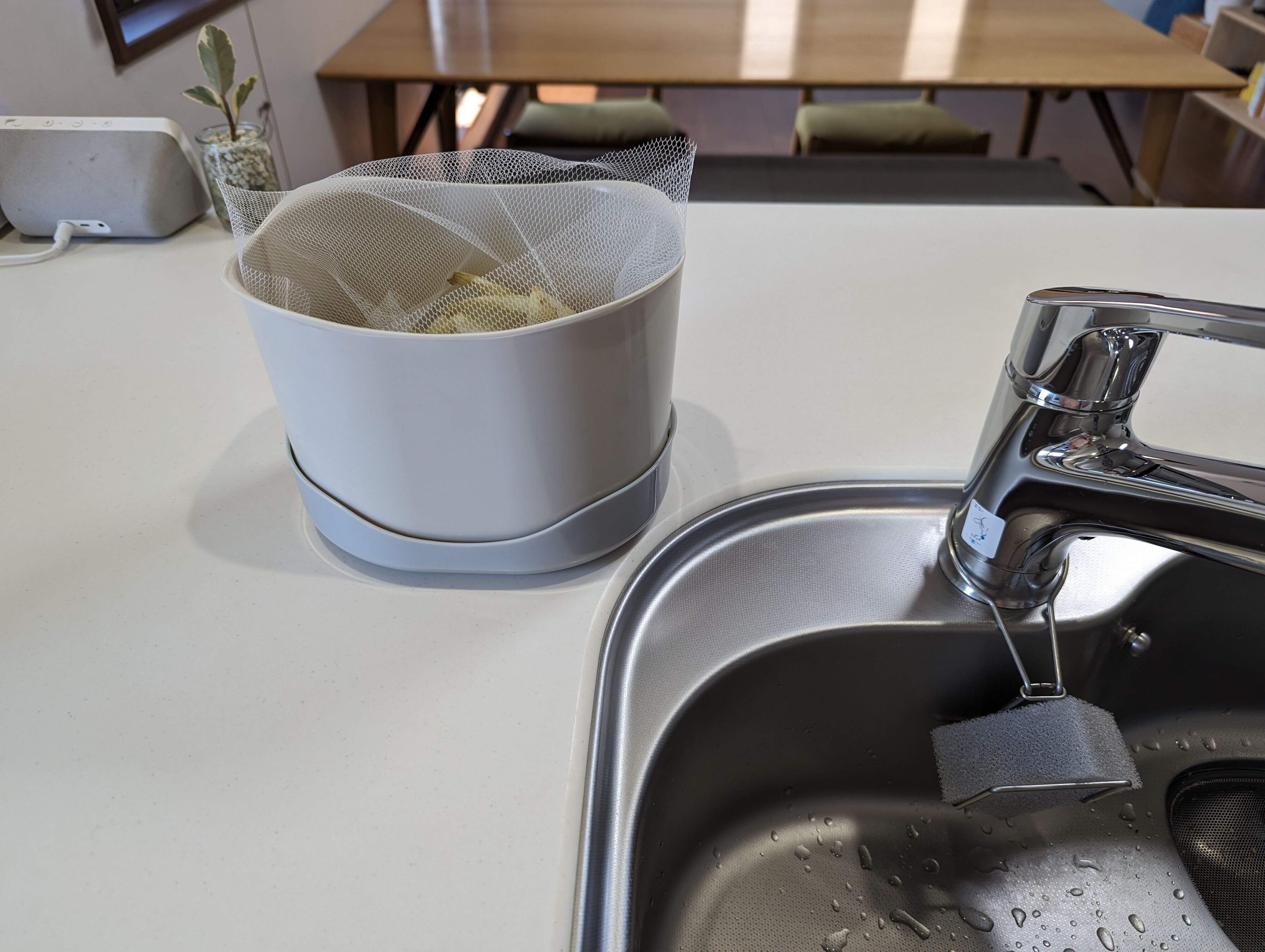 翌朝、乾燥処理が終わったごみを捨てて容器を洗ったら、水切りネットをセットしてまた生ごみを入れていく...という流れです。