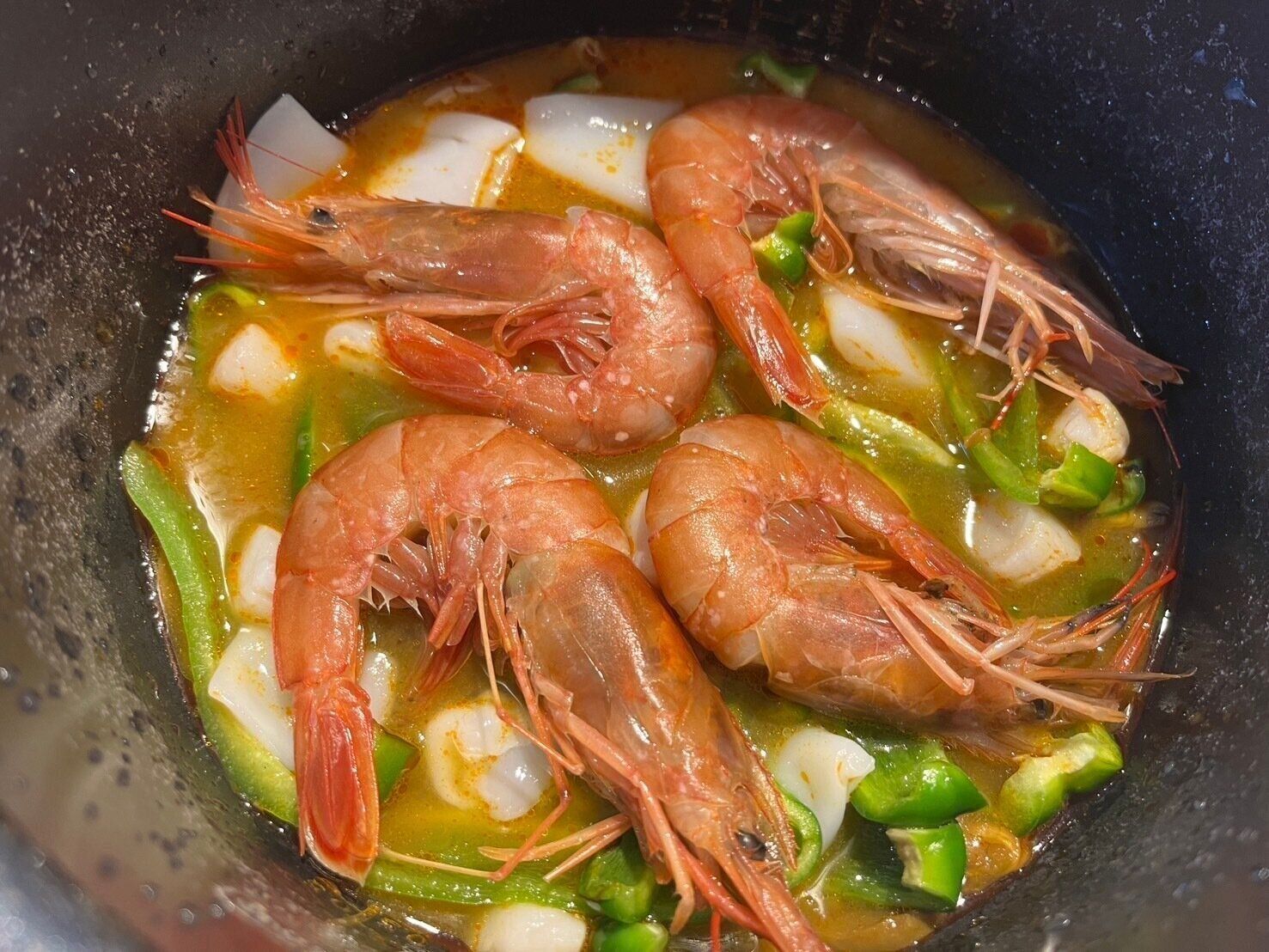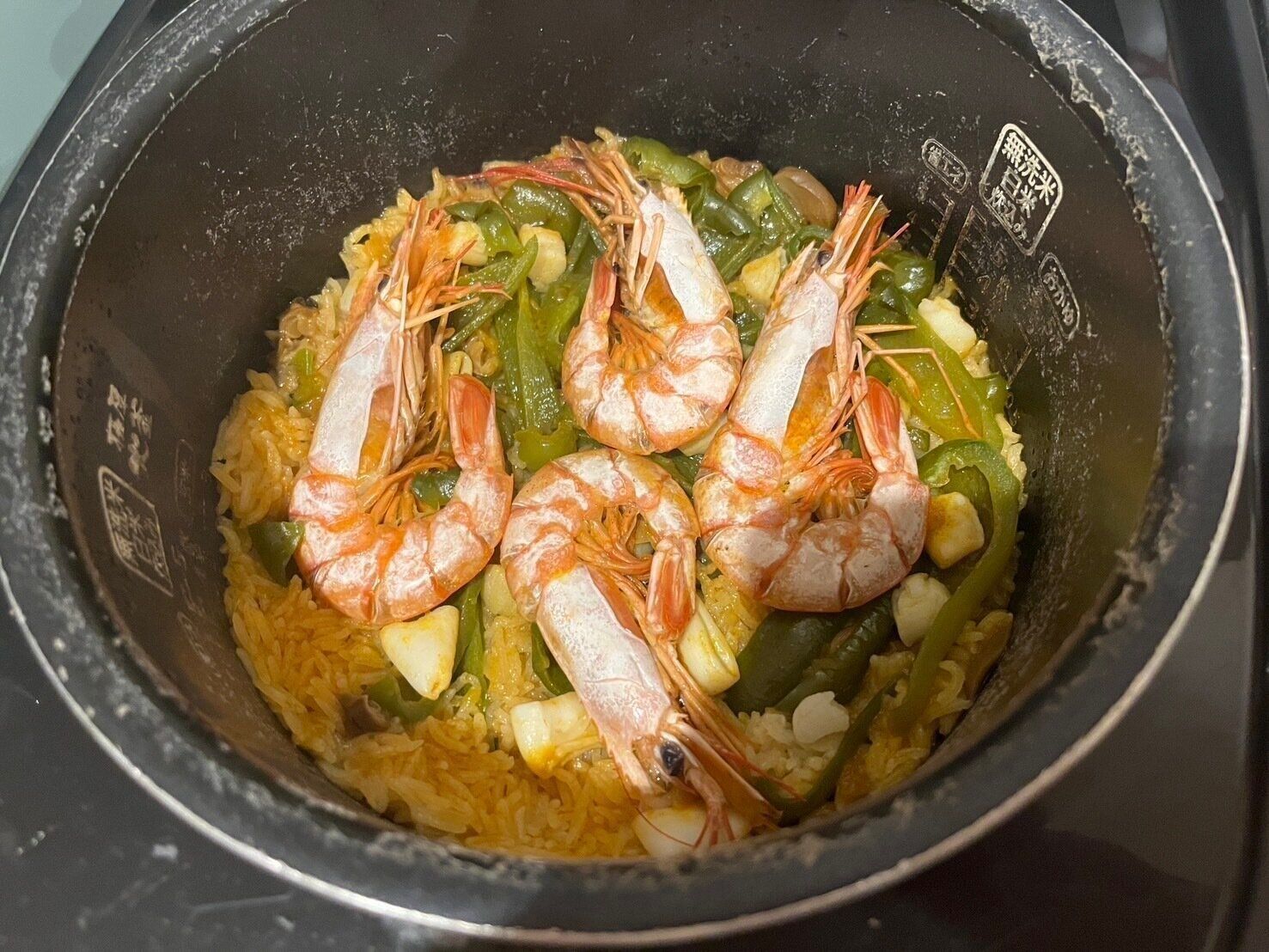 作り方には記載されていないのですが、具材はこのタイミングで追加するのがいいと思います。私はピーマンとシーフードミックスを炒めて入れ、いちばん上に生の殻つきのエビを乗せて炊飯しました!