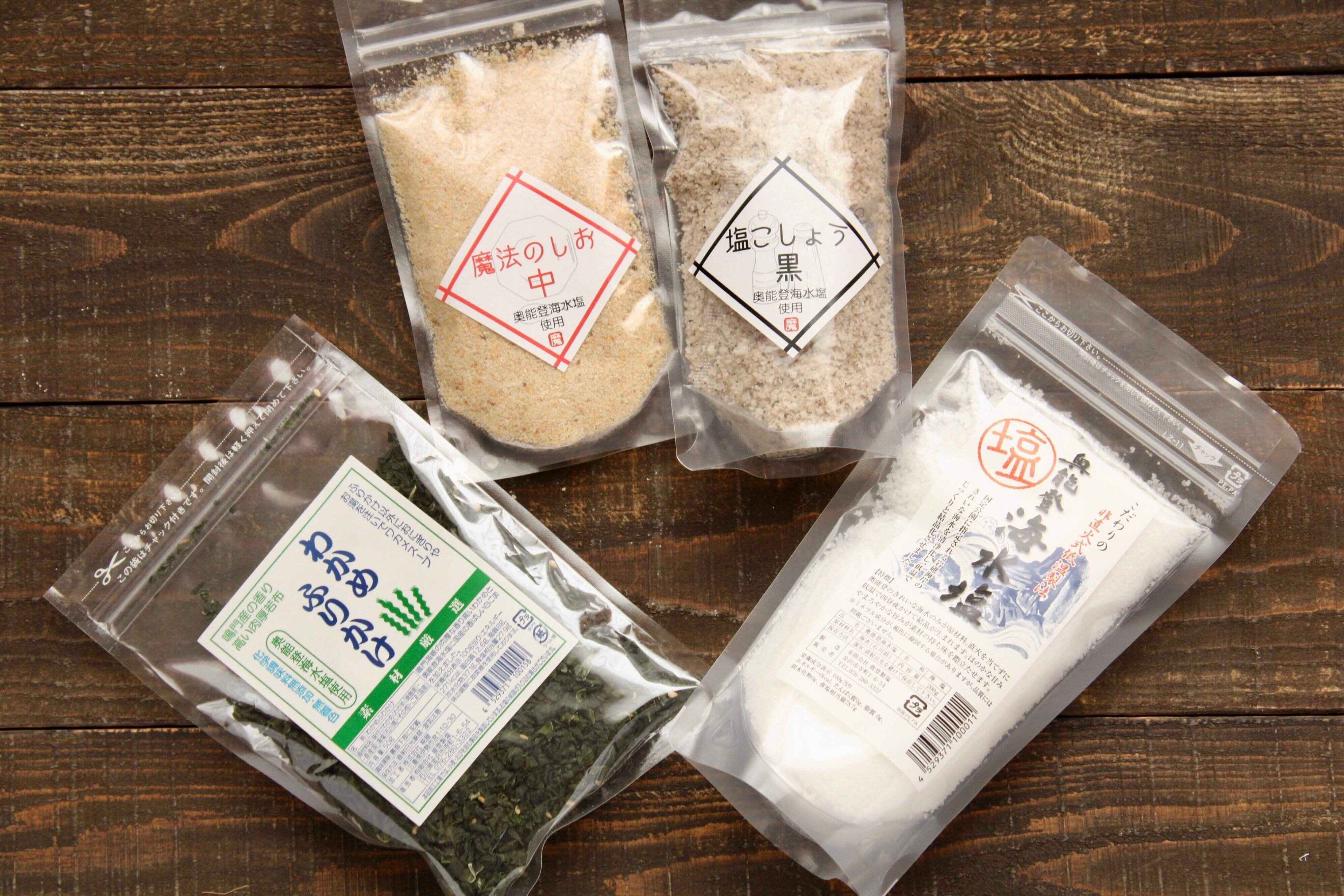 能登製塩には、その他にもいろいろな製品があります。お塩にコショウ、出汁の素となる素材が入っている製品や、スープの素、炊き込みご飯の素などもあります。どれもまろやかなお塩がきいて、素材の味を感じるものばかり。