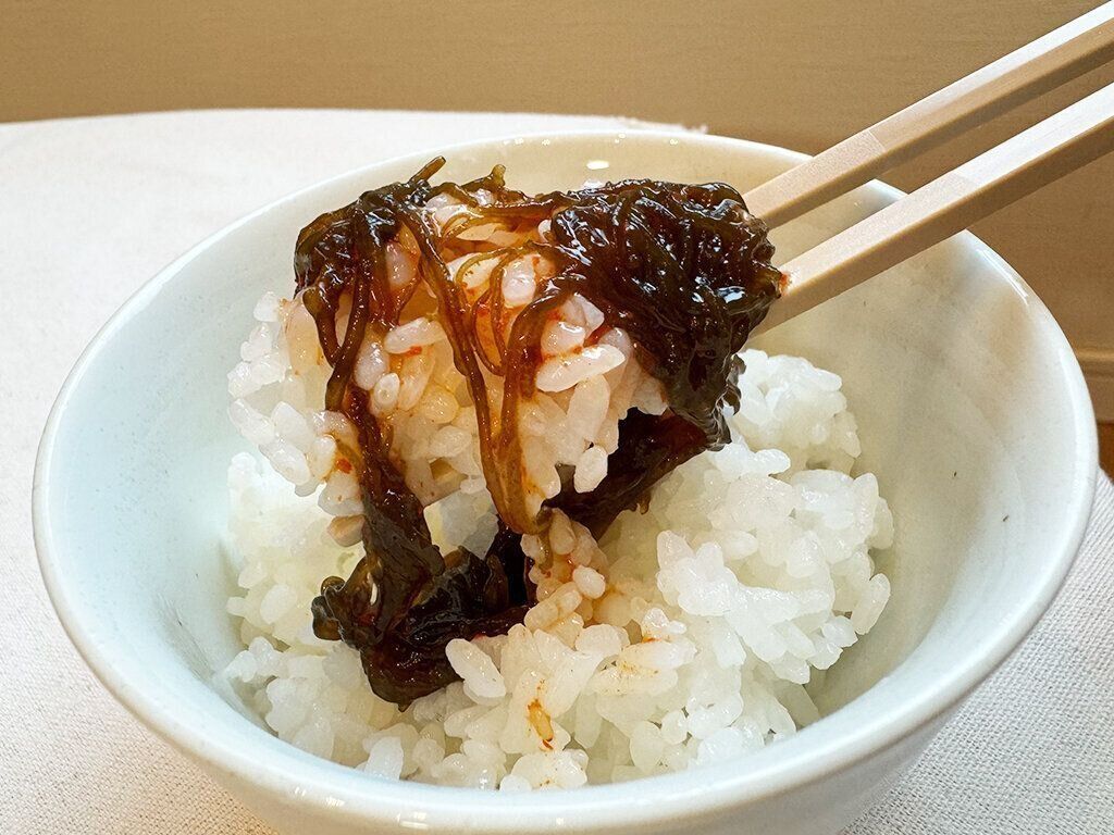 口に入れた瞬間ぷるんとした口当たりのいいもずくの食感がたまりません。