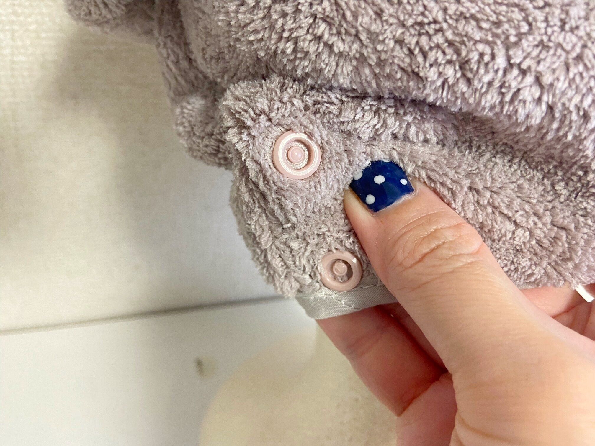 スナップボタンは2つついているので、頭のサイズに合わせて好きなほうを選んでください。
