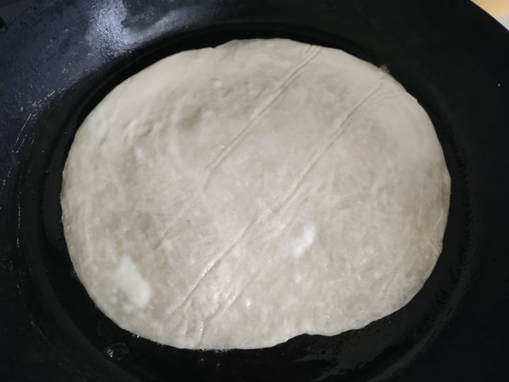 フライパンに凍ったままのパラタを1枚入れ、中火で片面を2分、裏返してもう片面を1分焼くだけで完成します。パラタ自体に油が結構含まれているので、テフロンのフライパンなら油は引かなくても十分です。