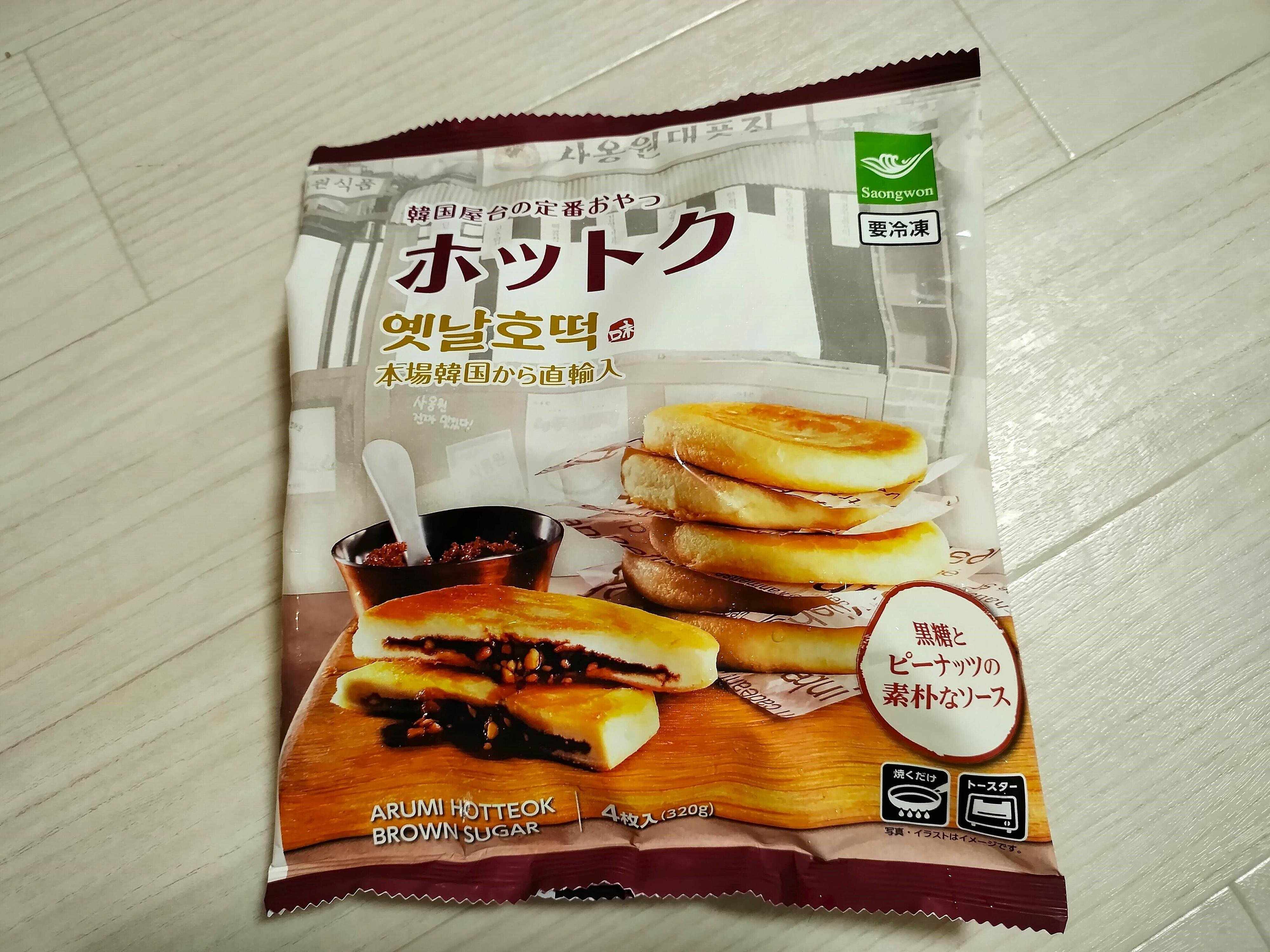 生地からつくるとかなり手間がかかるホットクも業務スーパーなら、冷凍のものを買えちゃいます。パッケージ表の「ホットク」の文字の下に書いてある韓国語は「イェンナル・ホットク(昔ながらのホットク)」と書いてあります。