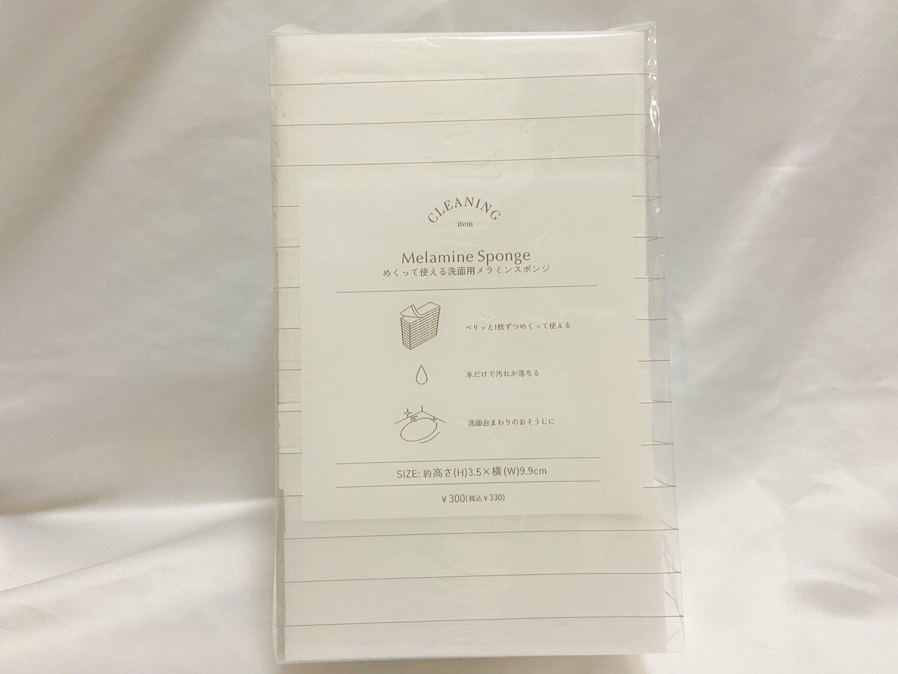 おすすめ新作お掃除アイテム2つ目は「めくって使えるメラミンスポンジ」(330円)です。洗剤を使わず、水だけで汚れを落とすことができるメラミンスポンジは、水をつけて軽くこするだけで、手アカや水アカ・油汚れが落とせます。メラミンスポンジはすでにお掃除の定番アイテム化していますが、めくって使えるというアイテムはあまり目にしたことない印象です。