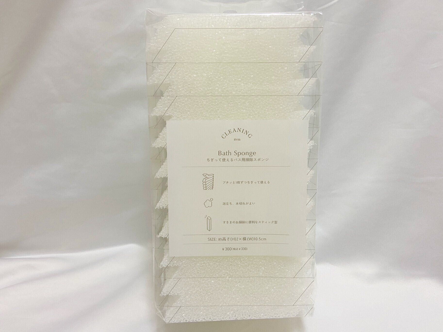おすすめ新作お掃除アイテム3つ目は「ちぎって使えるバス用掃除スポンジ」(330円)です。お風呂掃除はもちろん、洗面台・排水口・ドアレールの隙間にと様々な場所に使用できる掃除スポンジ。泡立ち・水切れが良いのもうれしいポイントです。