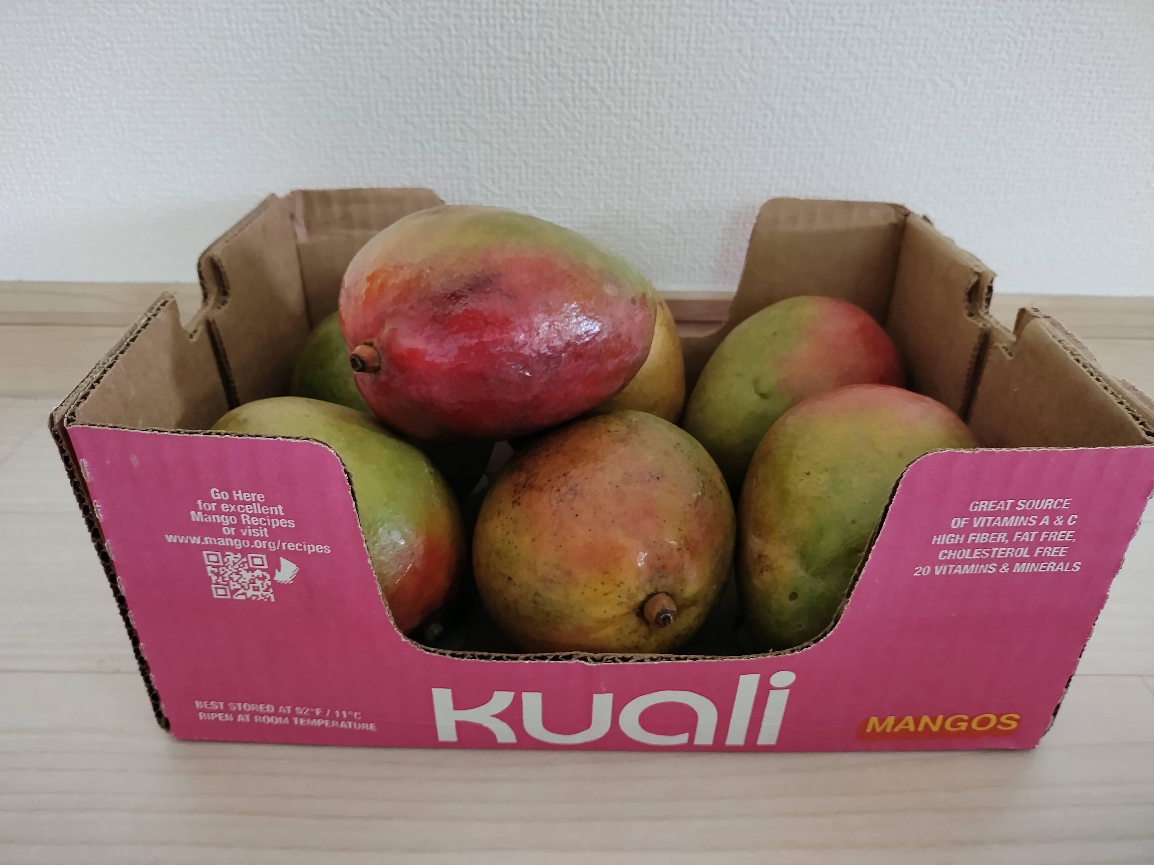 我が家でもっとも多くリピートしているのはおそらくマンゴーです。コストコでは時期によってマンゴーが何種類か販売されていますが、我が家でいつも買うのは、こちらの「Kuali」と書かれたメキシコ産のマンゴーです。