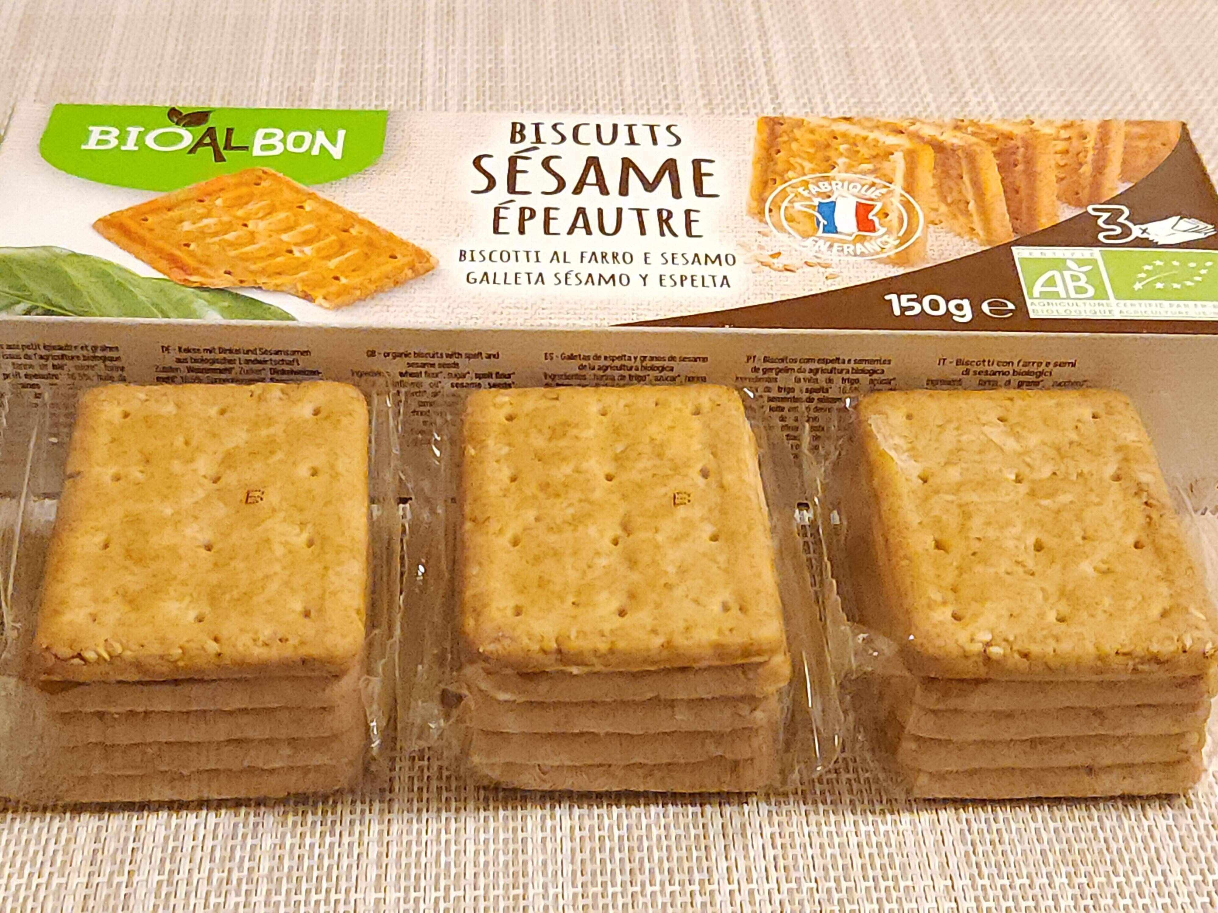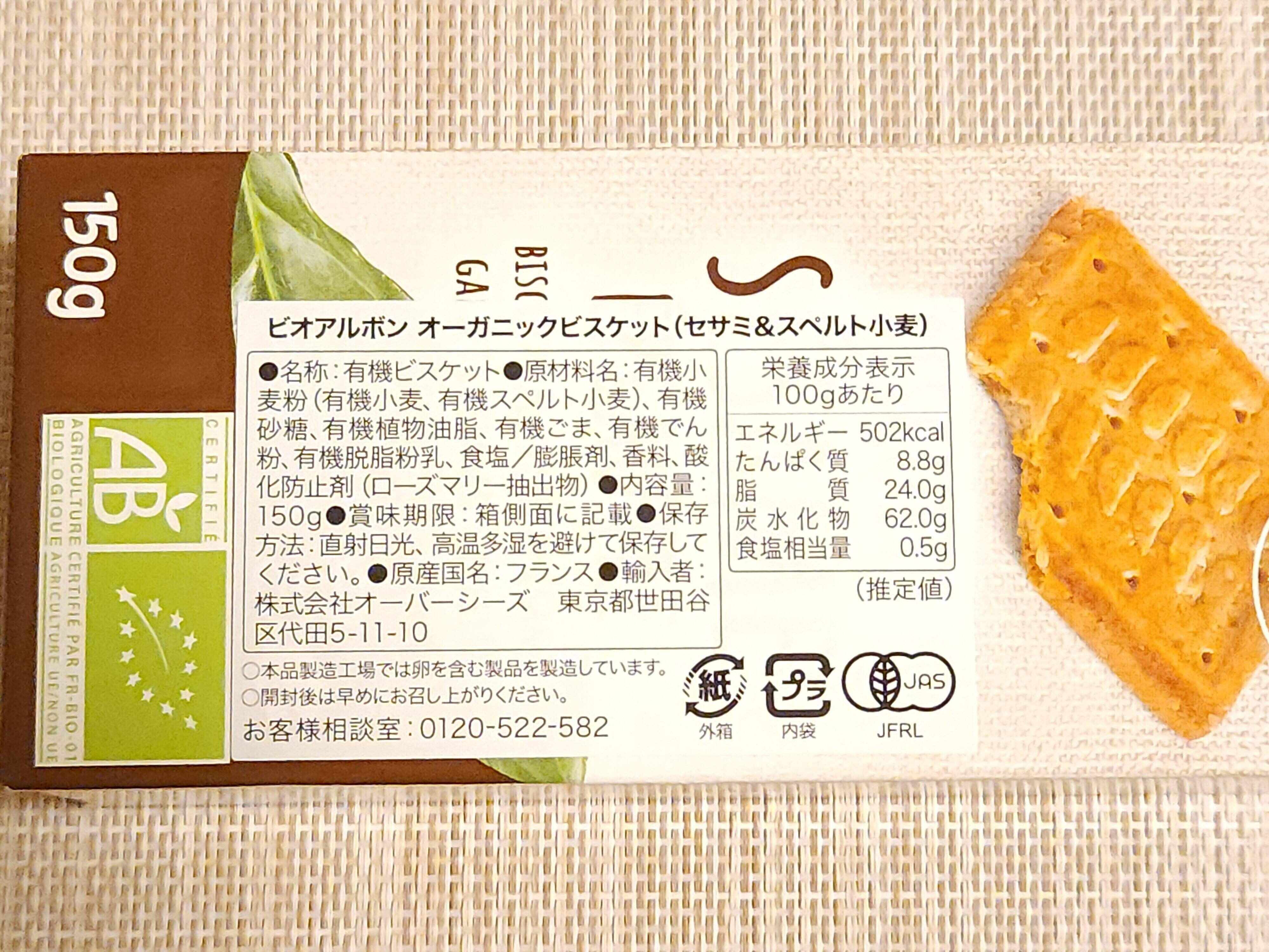 ビオアルボン社のオーガニックビスケット(セサミ&スペルト小麦)は、オーガニック材料をふんだんに使用しており、風味も食感も完成度の高いビスケットで、量もしっかり入って500円以下で購入できるのでお得感・満足感もあるおすすめ商品です。