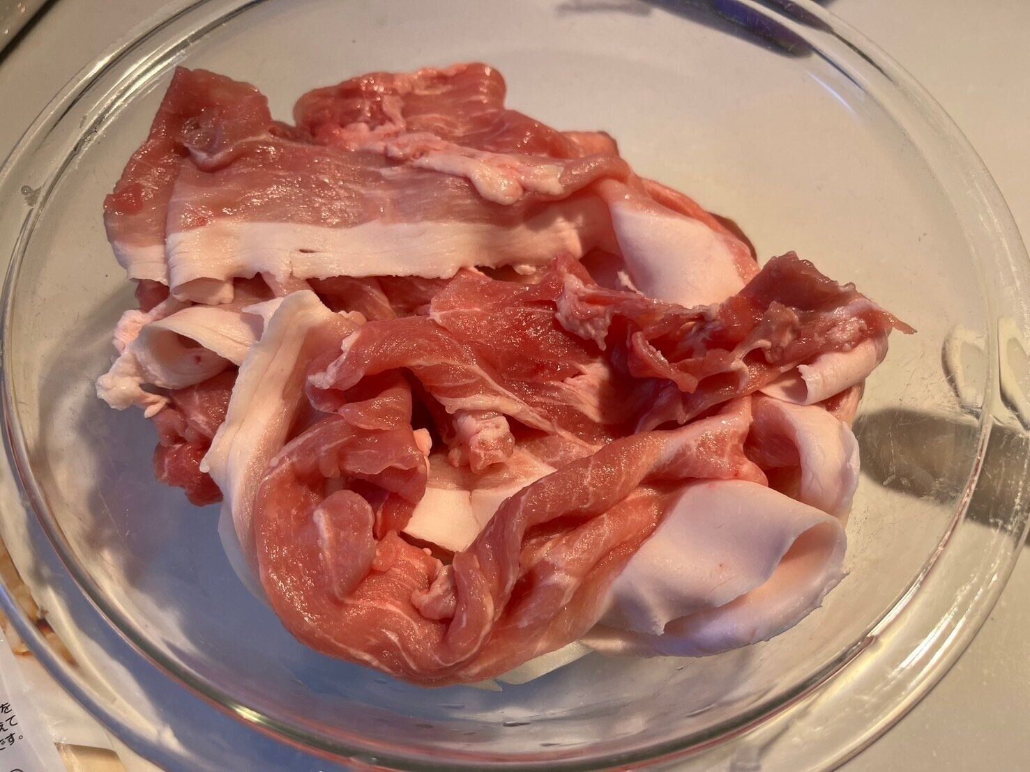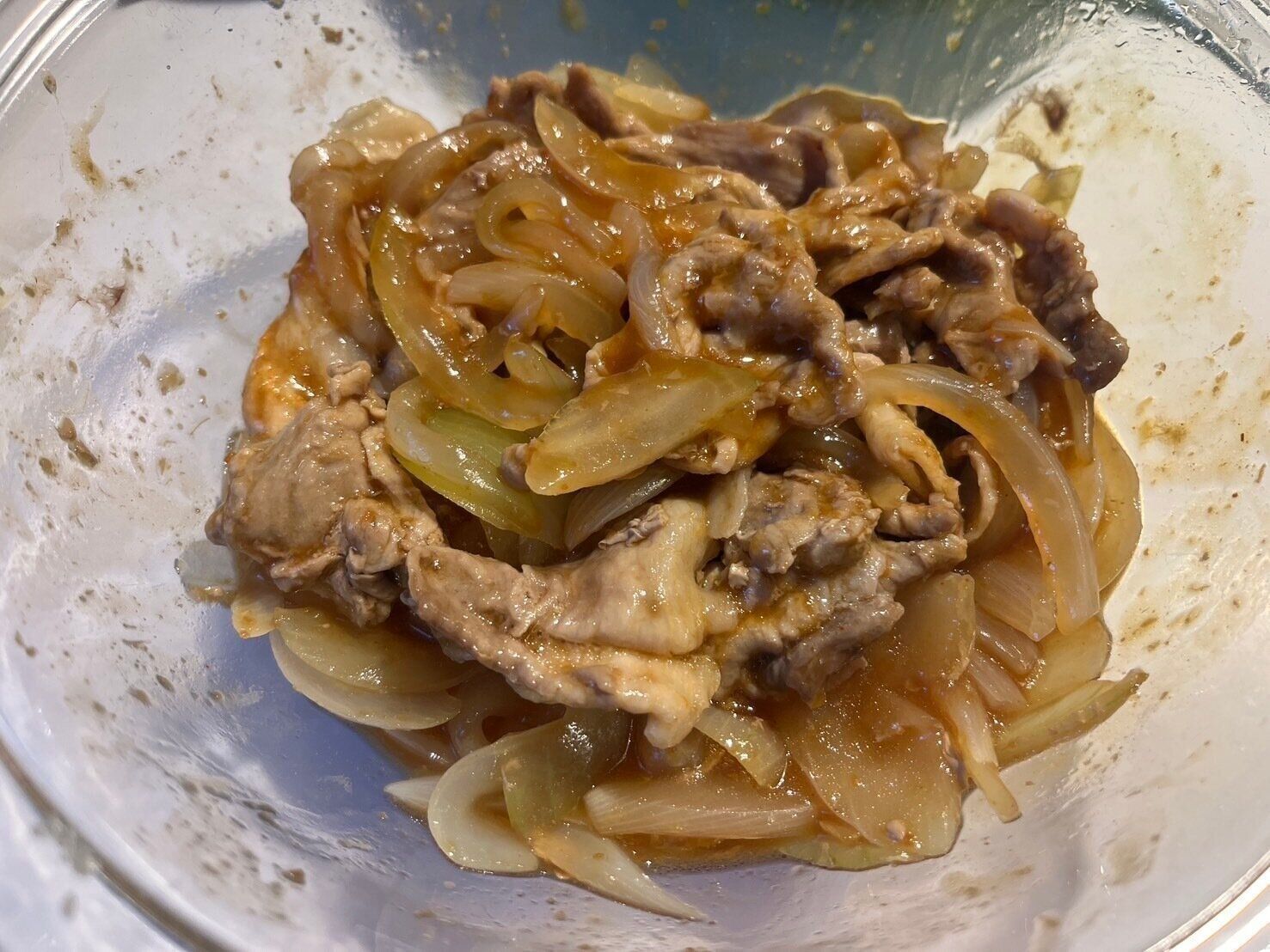 薄切りにした玉ねぎの上に豚肉を並べ、ラップをかけてレンジで加熱します。