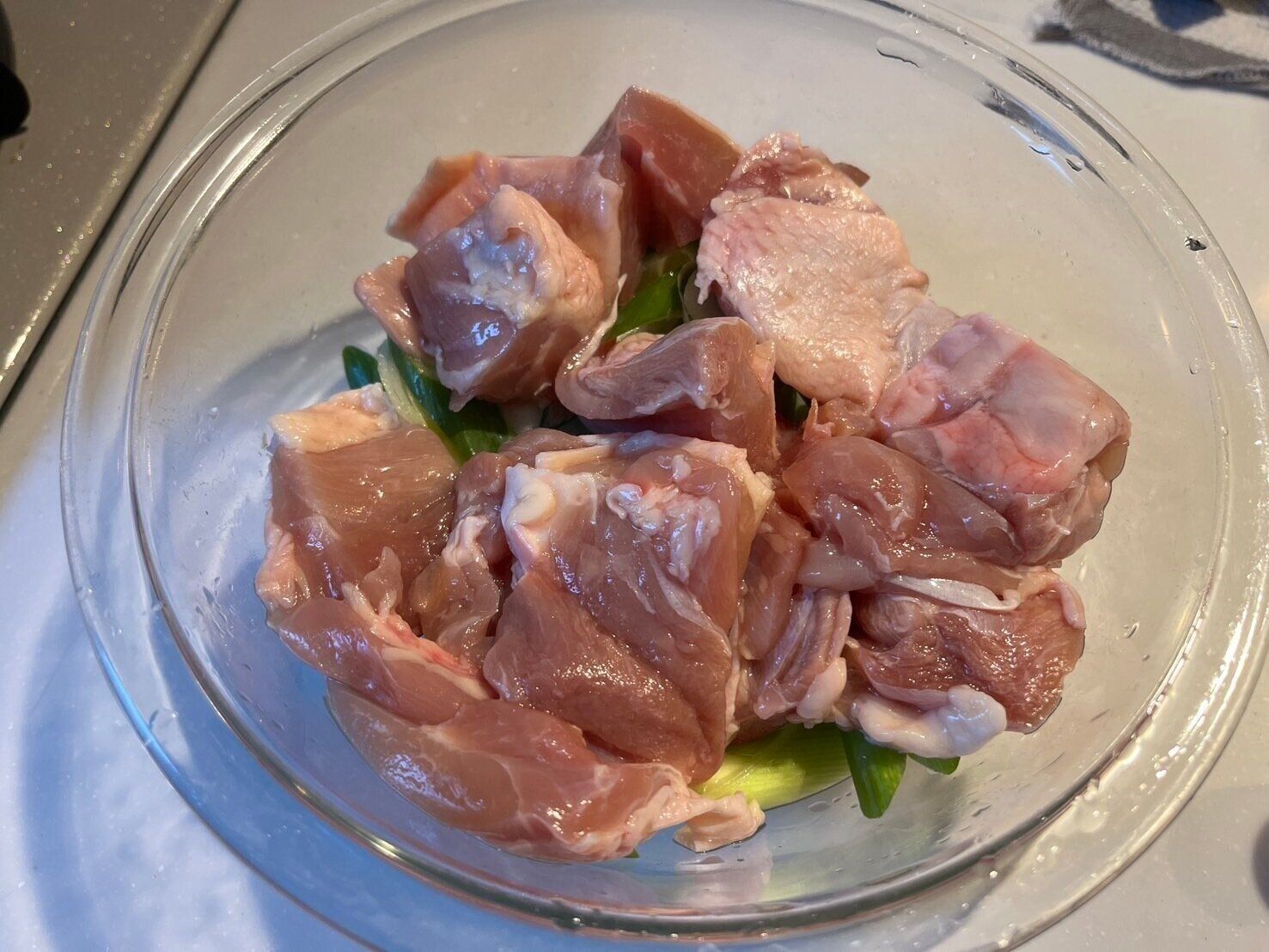 斜めに切った長ねぎの上にカットした鶏もも肉を乗せ、ラップをかけてレンジで加熱します。