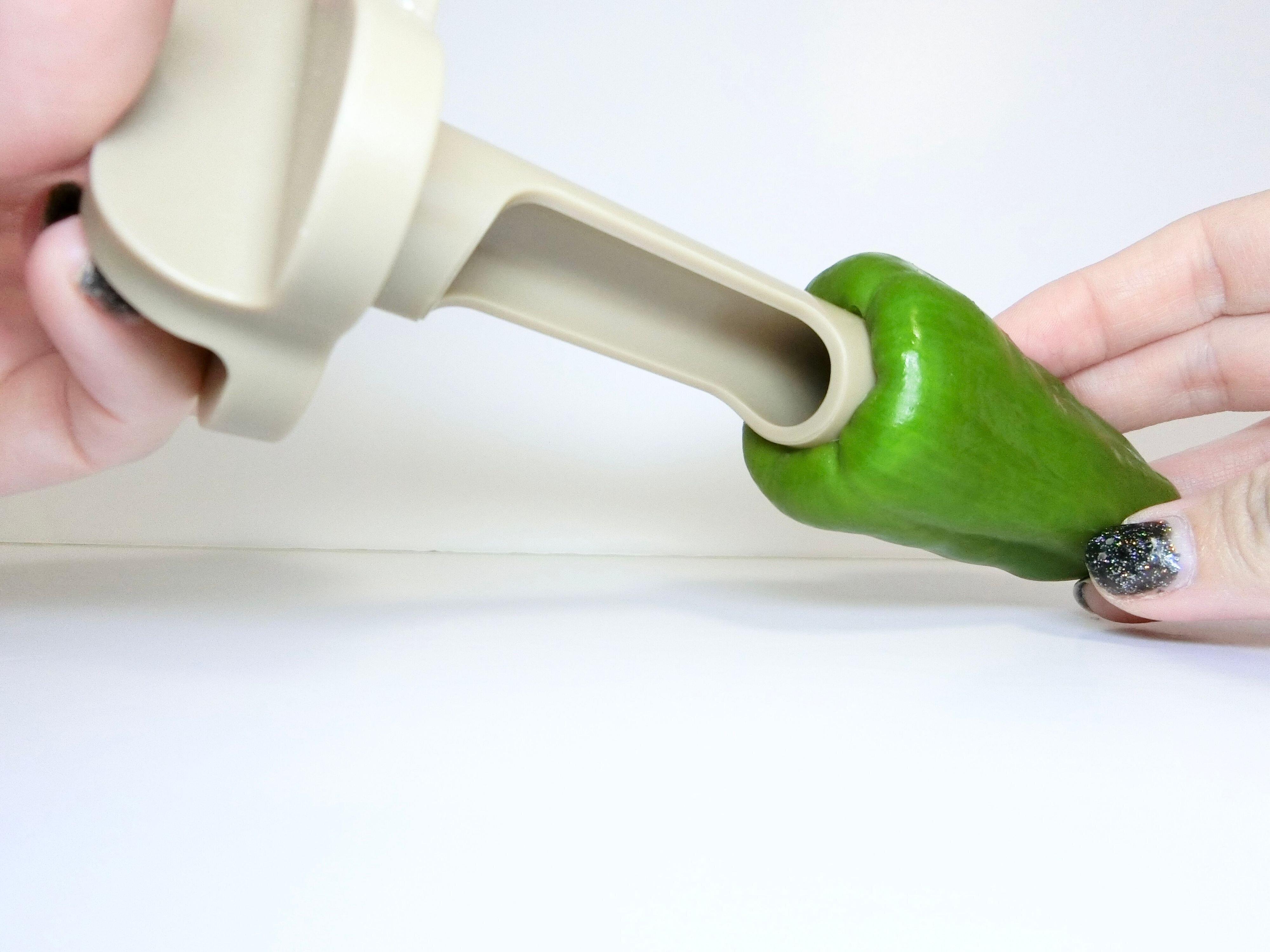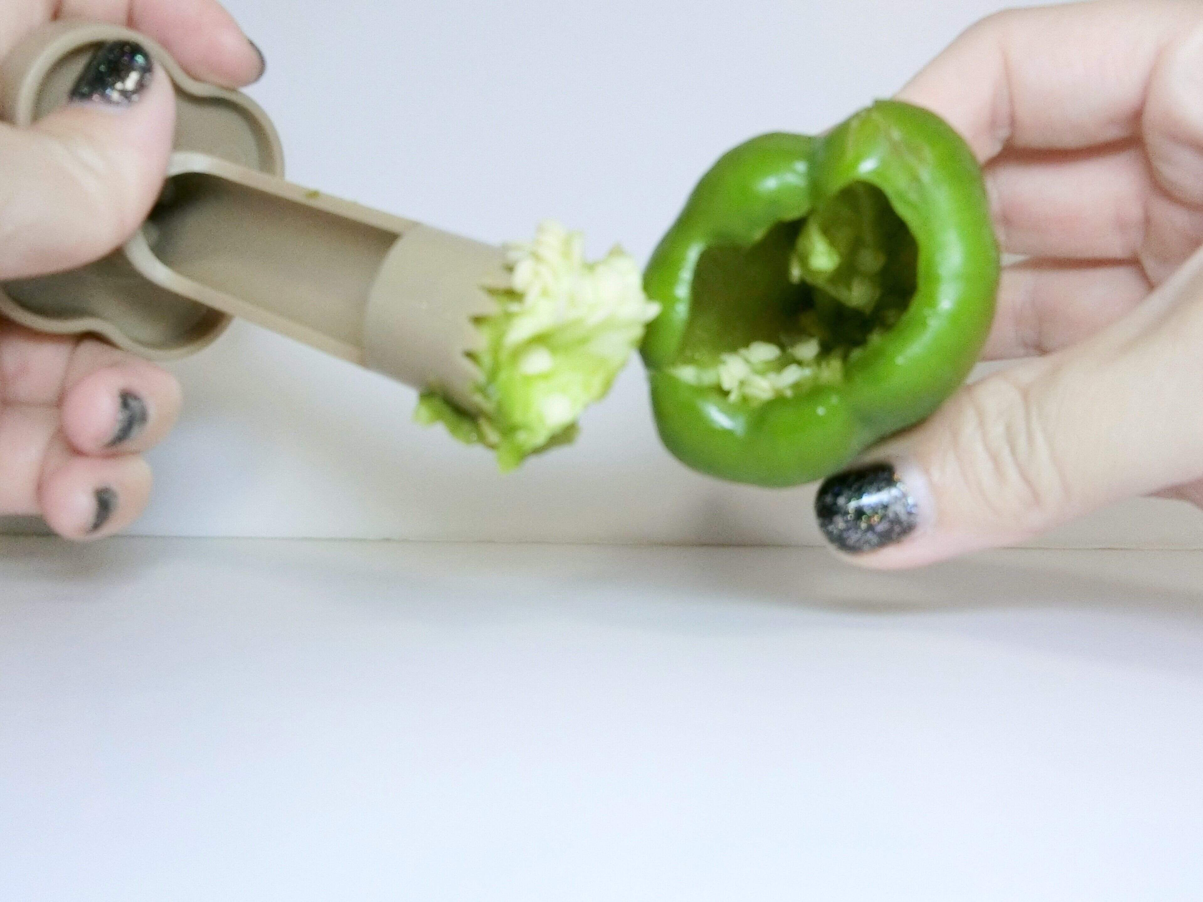 使い方はとっても簡単。ピーマン(パプリカ)の芯の部分にゆっくりと本体を刺します。力が強すぎると、食材が裂けてしまうので要注意。