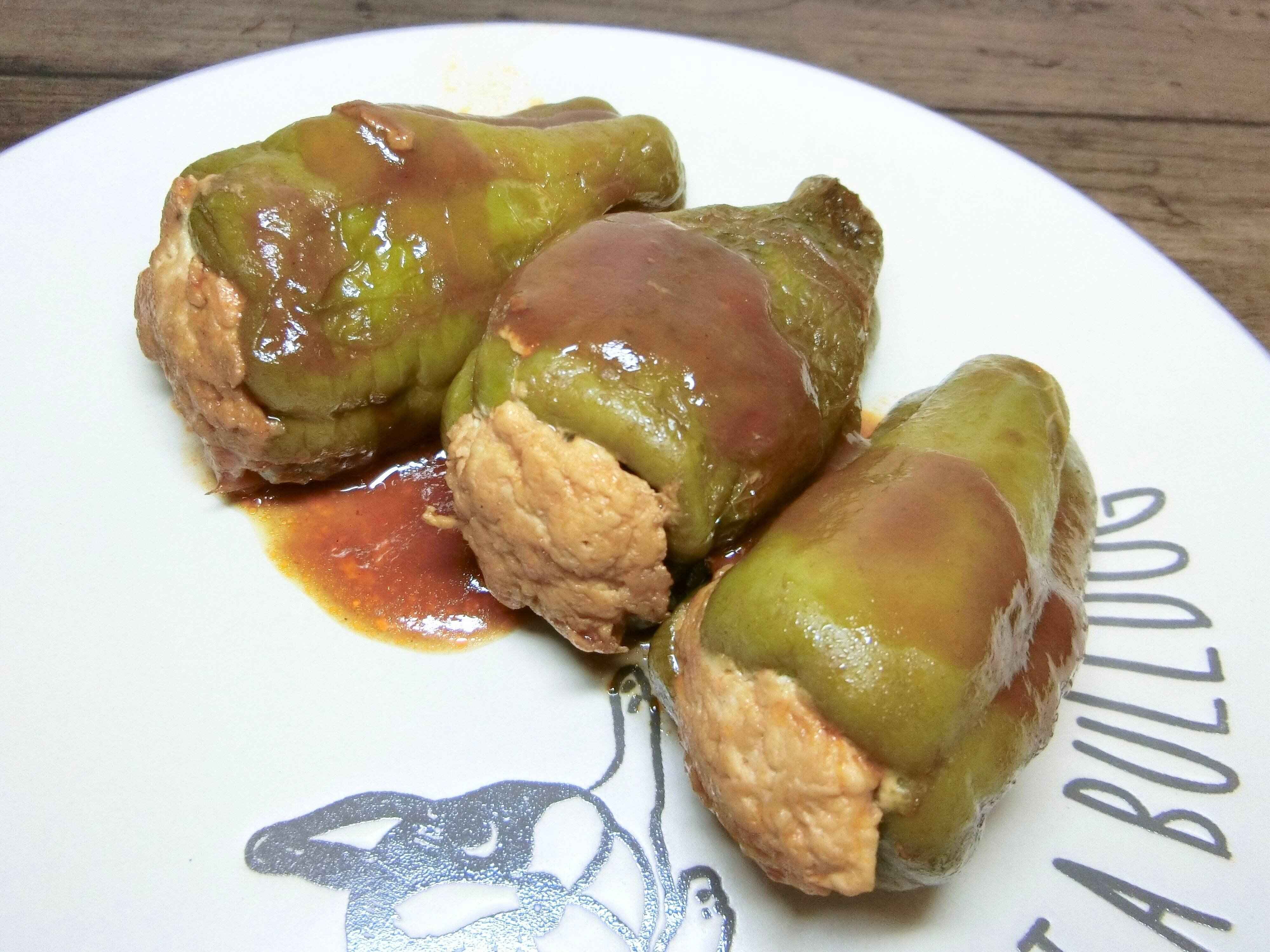 芯をくり抜いたピーマン(パプリカ)の中にひき肉でつくったタネを詰めて調理すれば、簡単にまるっと野菜を使った肉詰め料理をつくることができます。筆者はピーマンを半分にカットしてつくるピーマンの肉詰めは、調理している間にいつも肉がピーマンから外れてしまうのですが、この調理法なら詰めているので失敗なしでつくれました。