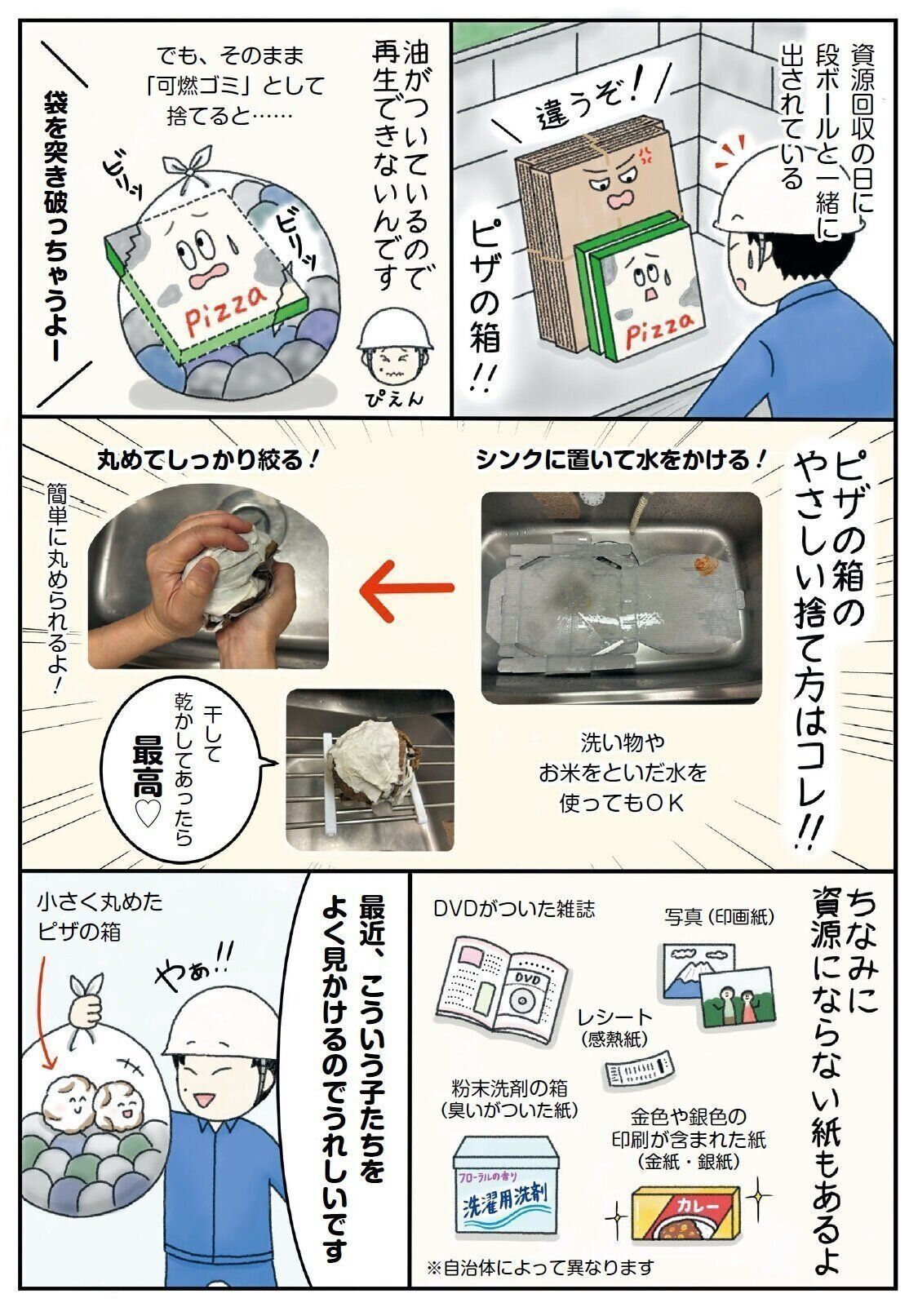 ピザの箱は再生できるの?ゴミを集める人にやさしいゴミは、地球にもやさしい。芸人とゴミ清掃2足のワラジを履いて12年のマシンガンズ滝沢さんが日々のゴミ収集で出合った「やさしいゴミ」を妻がまんが化!