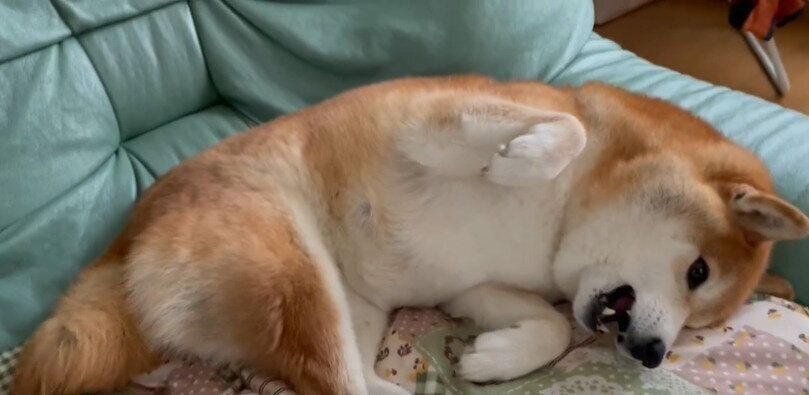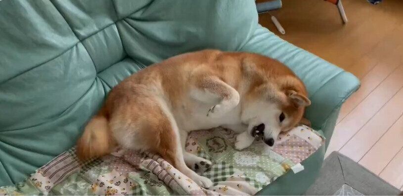 ソファの上で横たわり、どこかしら怒っているような表情の柴犬。飼い主さんが撮影した動画には、そんなハルちゃんの姿が映っていました。