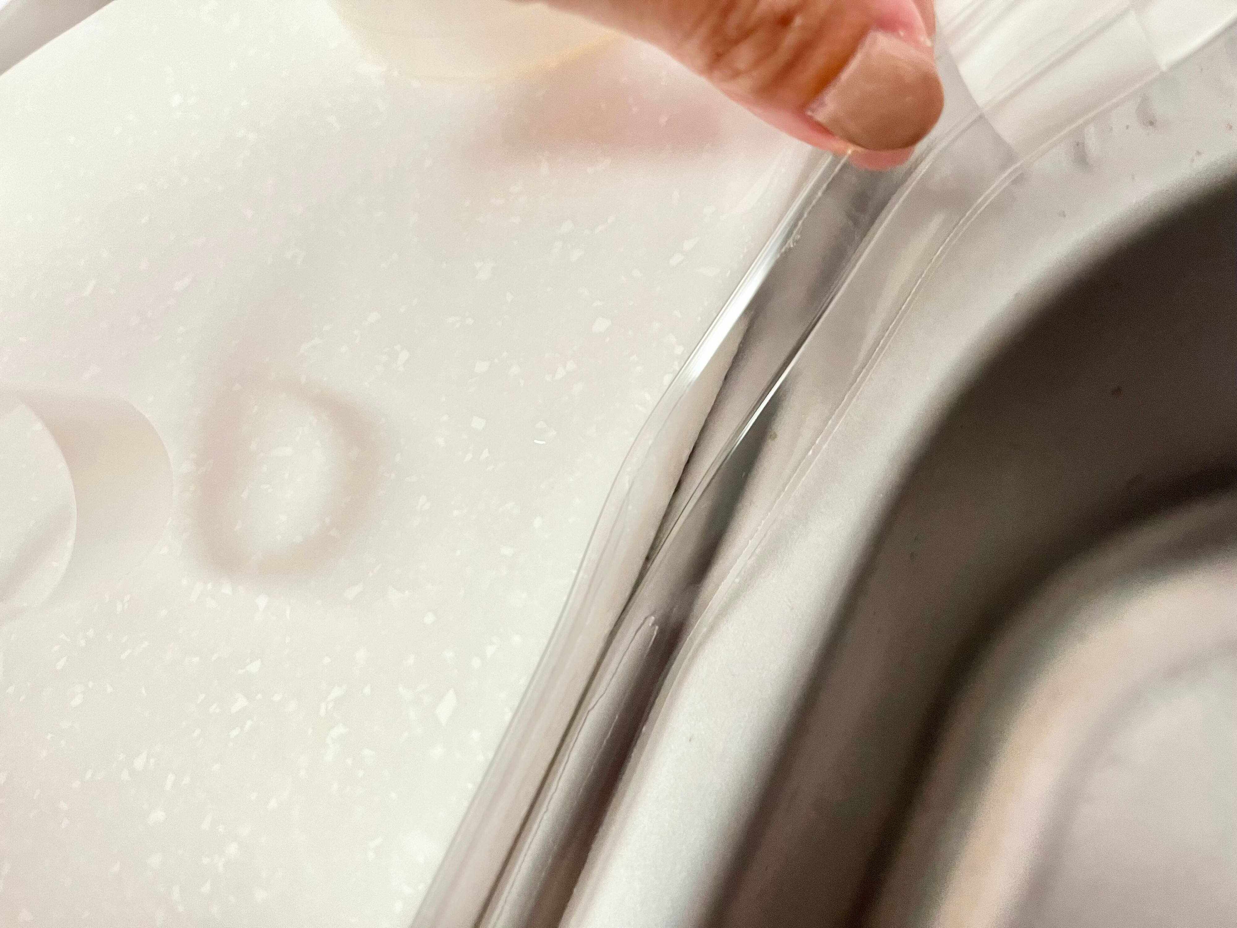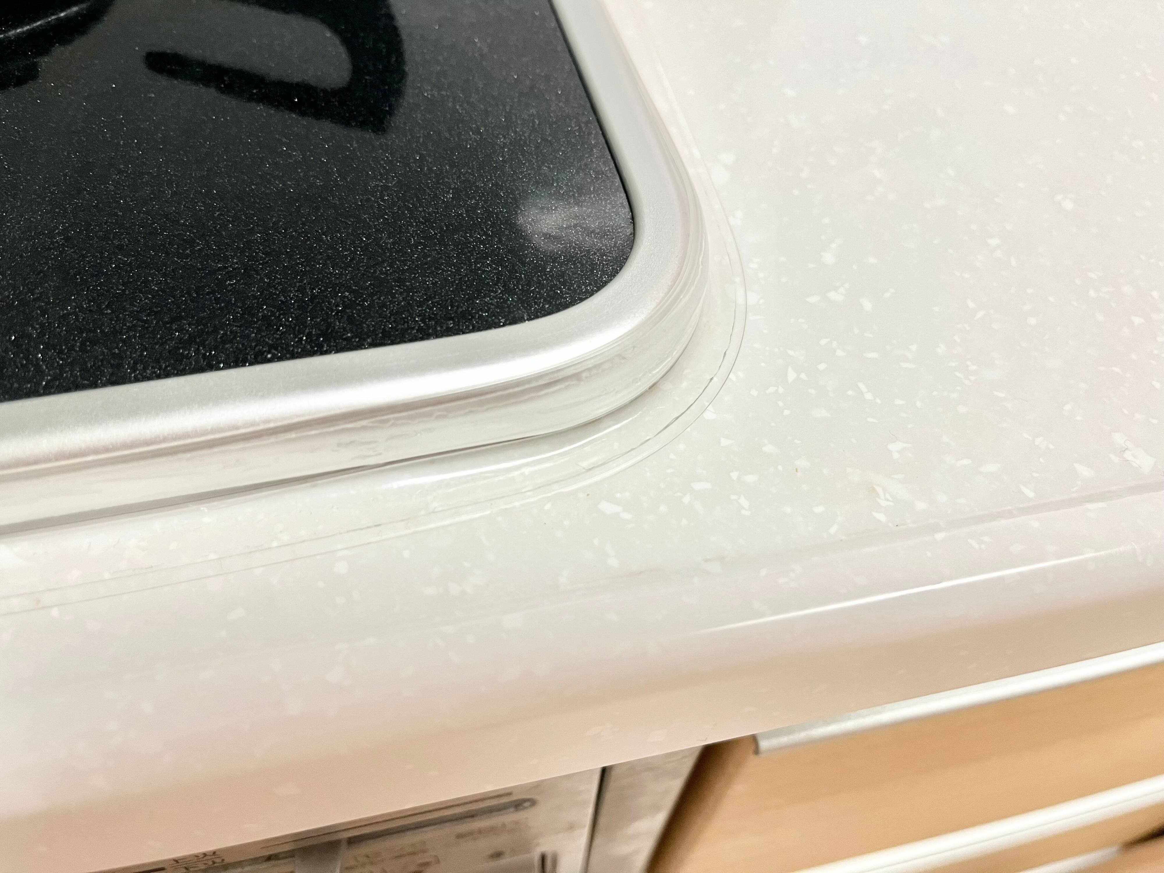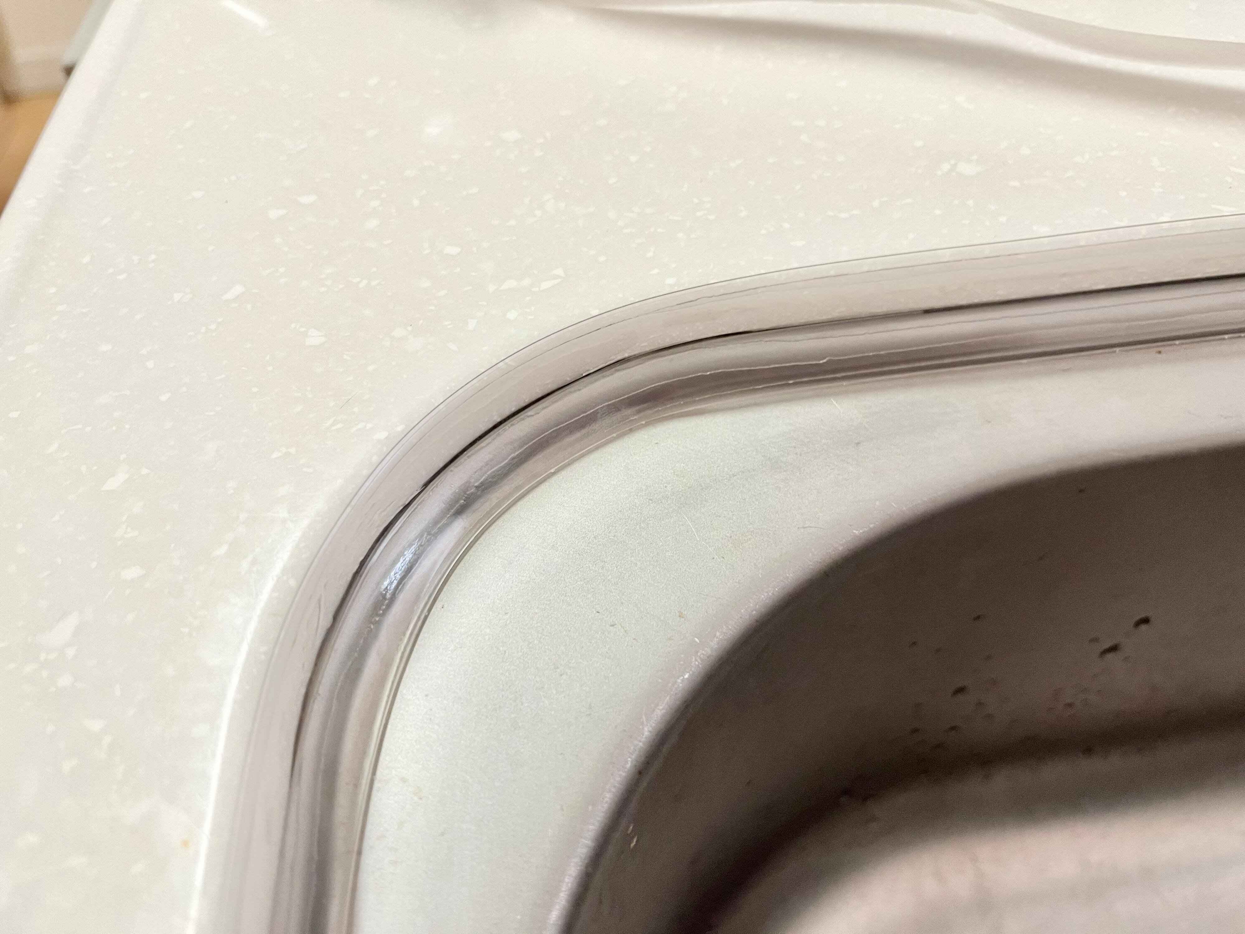 シンクまわりを一周したら、ハサミでカットしたら完成です。透明だから近くで見ても悪目立ちしにくいのもいいですよね。たったこれだけでシンクまわりの隙間に汚れが入り込むことを防いでくれます。しかも汚れたらテープを張り替えるだけでいいので、お掃除もグーンとラクになりますよ!