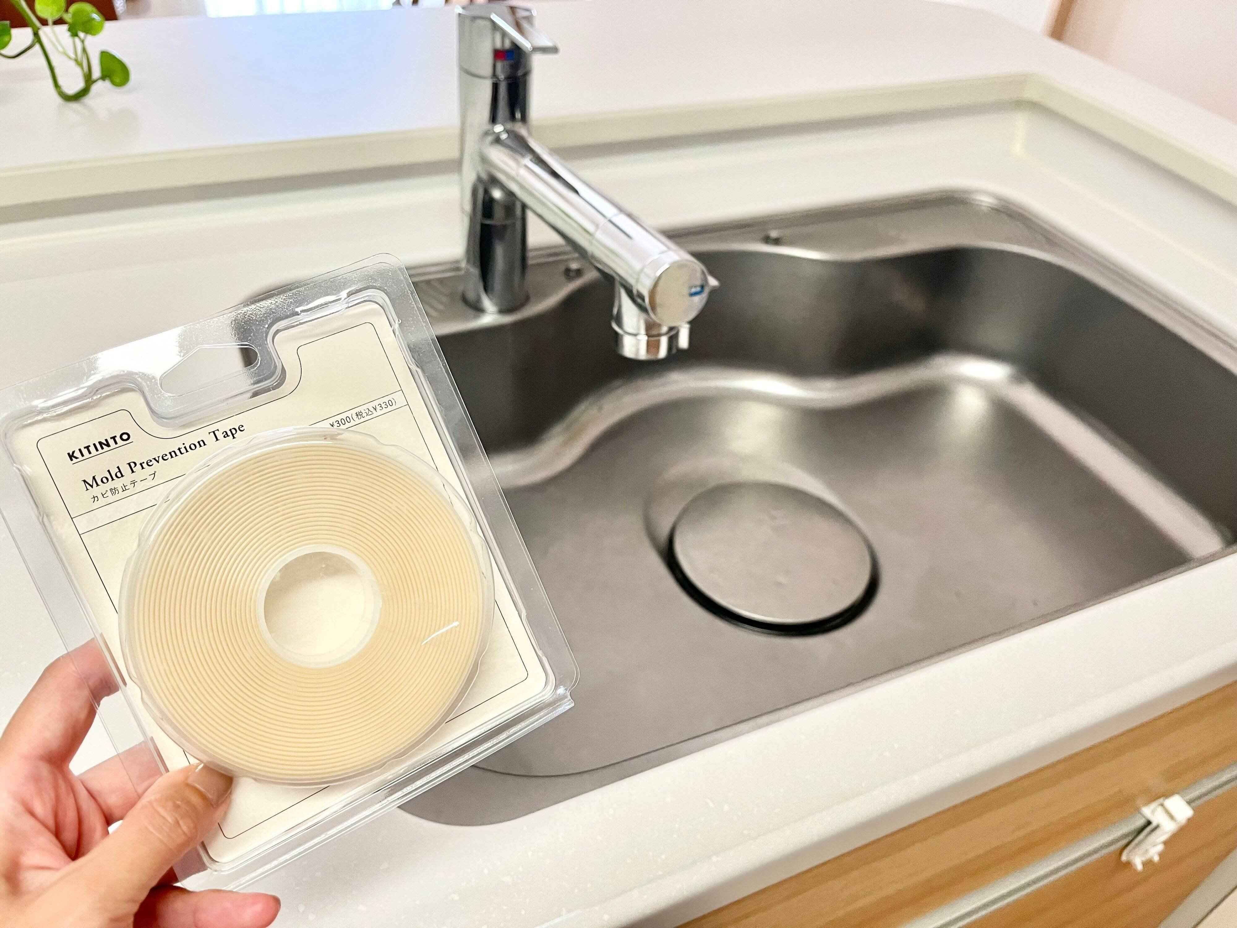 こちらの「カビ防止テープ」は、貼るだけでシンクまわりの隙間に汚れが入り込んだりカビが発生するのを防いでくれる超便利なラク家事グッズです。