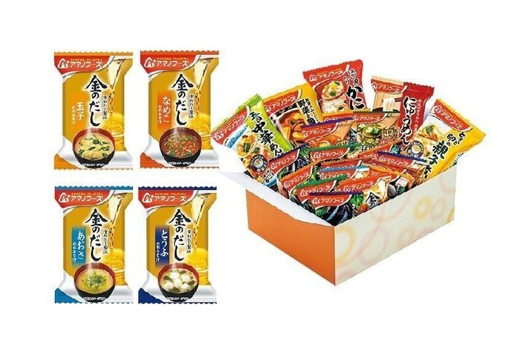 〔内容〕みそ汁(定番と減塩の2タイプ×4種類×各1食)、金のだし(4種類×各1食)、スープ、雑炊、にゅうめん、カレー(各1食)、総菜、Theうまみ(各2種類×各1食)