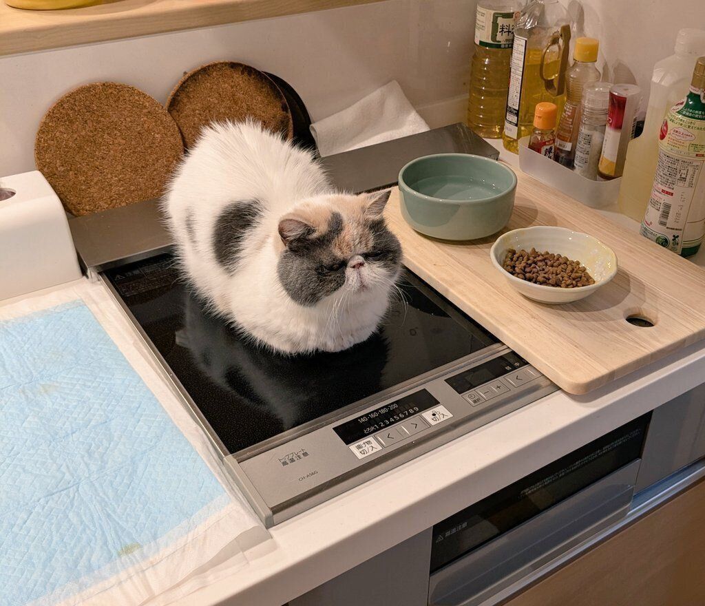 「今年の5月頃から、腎臓の病気を患っておりまして、なぜだかそれ以来、クッキングヒーターの上にいることが多くなりました。たまに別の場所でくつろぐこともあるのですが、気づくとここで寝ております。おそらく高い場所でさらに冷たくて気持ちいいので、この場所を気に入っているのだと思います」