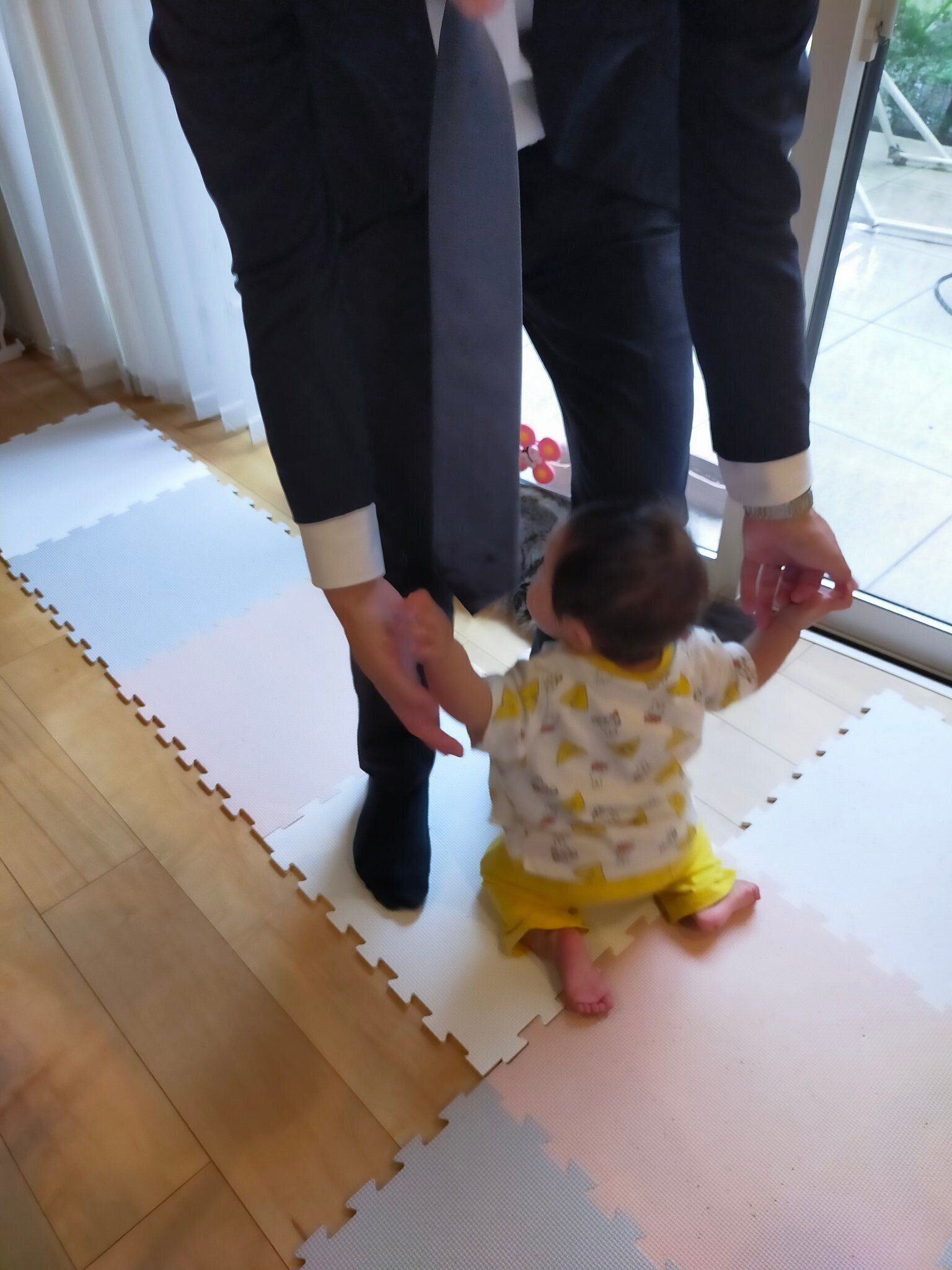 「娘はまだ『いかないで!』という発想はできないと思うので、パパが写真の左側からこちらに来るのが見えて『抱っこ』って甘えたのだと思います」
