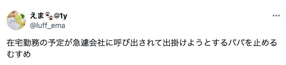 えま1yさんが投稿したのは、在宅勤務の予定だったパパが急きょ会社に呼ばれて出勤しようとしたときのこと。