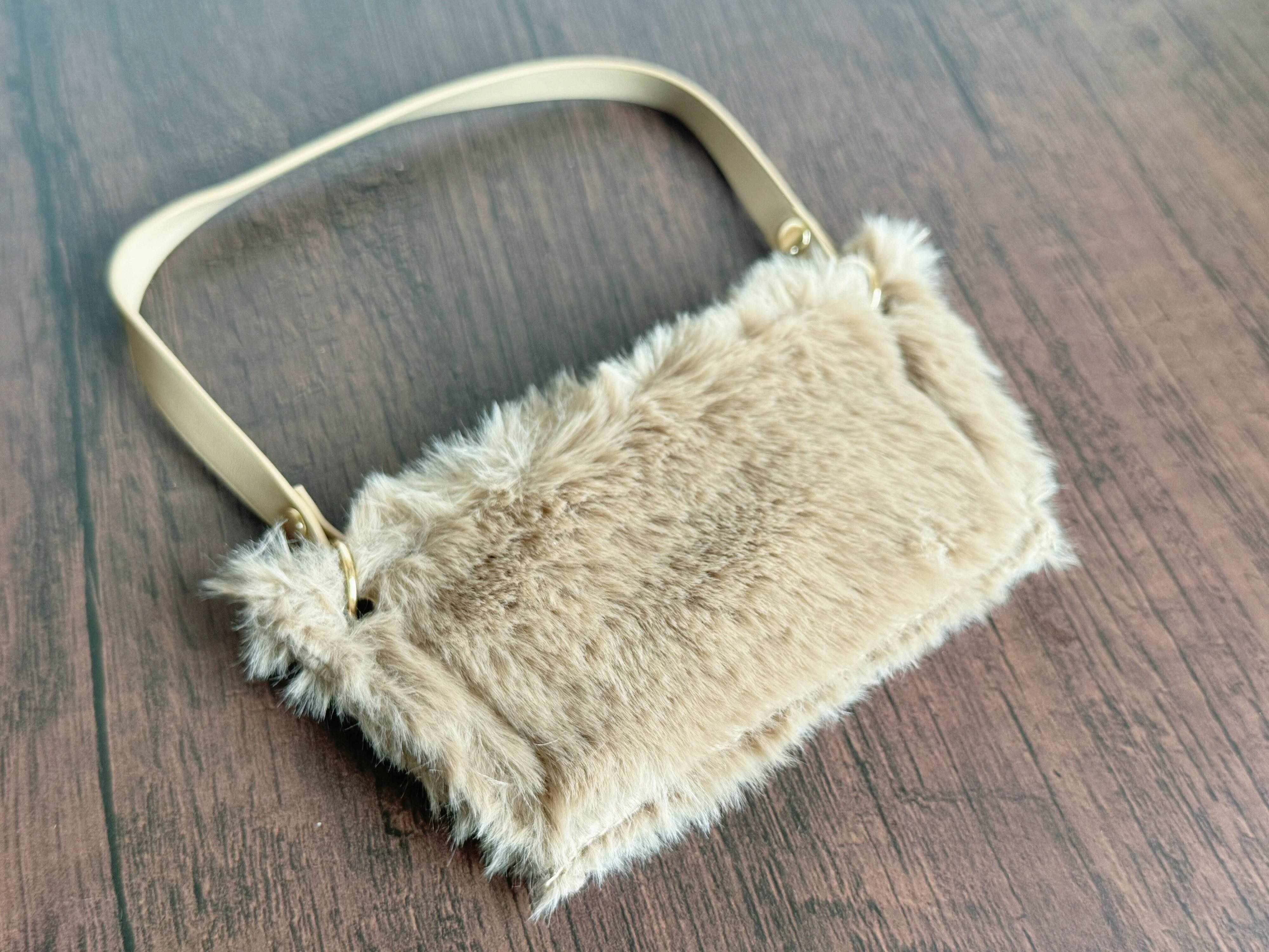 ベージュ色のフェイクファーですが、毛並みが柔らかく近くで見ても安っぽさはありません。フェイクファーは両面に施されています。ほかにも、持ち手が同系色のレザー調になっていたり金具はゴールドで統一するなどのこだわりも見られます。
