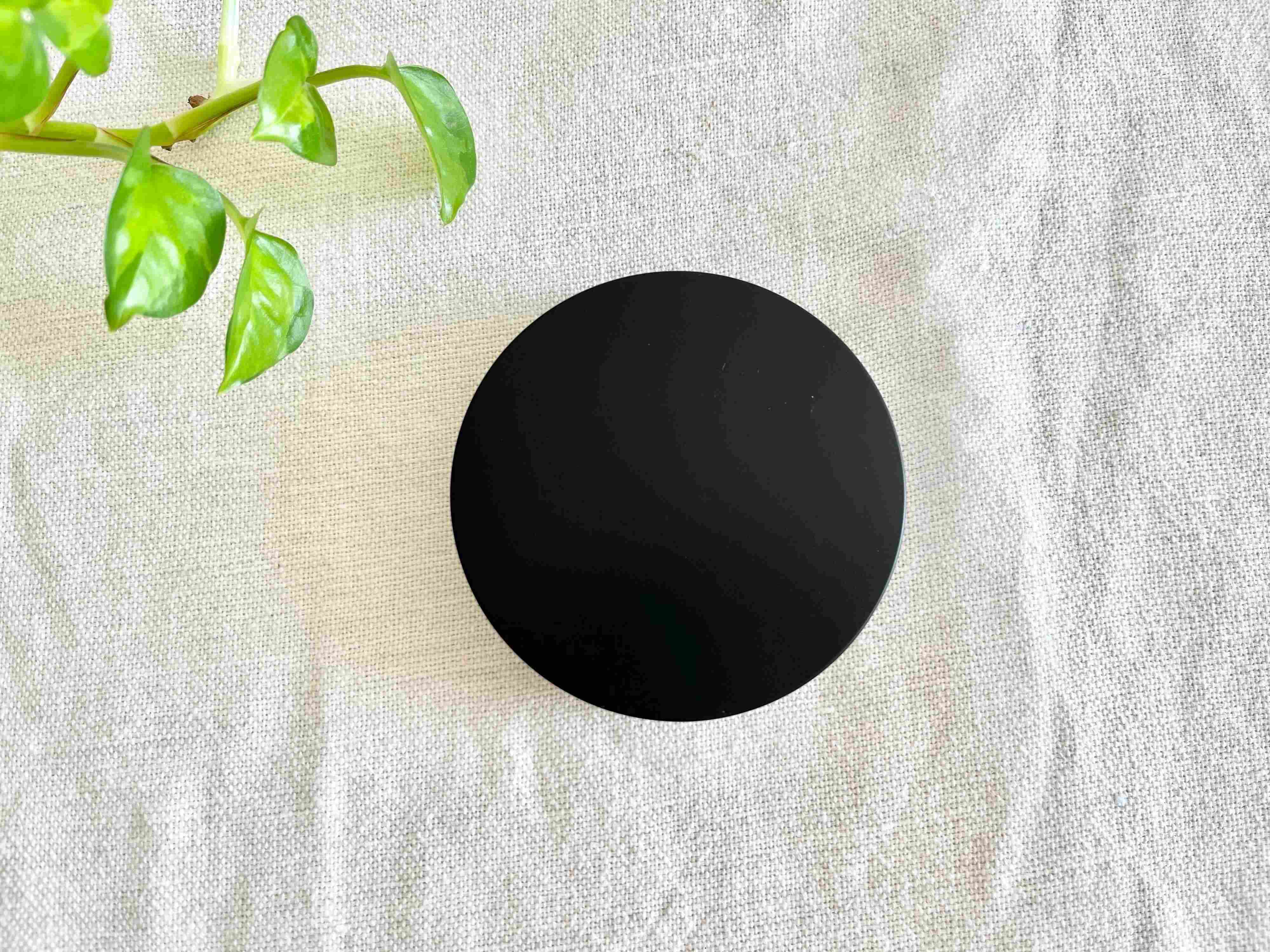 見た目はクールなブラックでシンプルなデザイン。大きさは直径7.5cm×高さ1.5cmぐらいのコンパクトなサイズです。