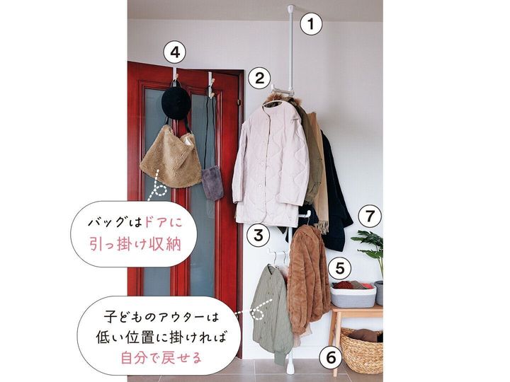 使いやすく、散らからないアウターやマフラーの置き場所、迷いますよね? 整理収納アドバイザーたちによると、リビングか玄関につるすのが正解でした。ニトリの「つっぱりハンガー」なら、省スペースで設置しやすく、縦の空間を生かすことで家族分のアウターやマフラーが収納できます。コスパも良くて最高!