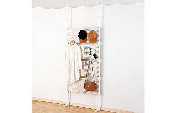 壁面を使って収納力を高められるパンチングボードがおすすめ。アウターも小物も掛けられます。