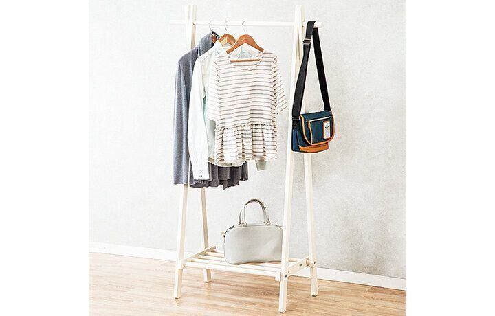 ナチュラルでインテリア性が高いハンガーラックも◎。家族のアウターを収納して、さらにバッグを置いたり掛けたりできて便利です。