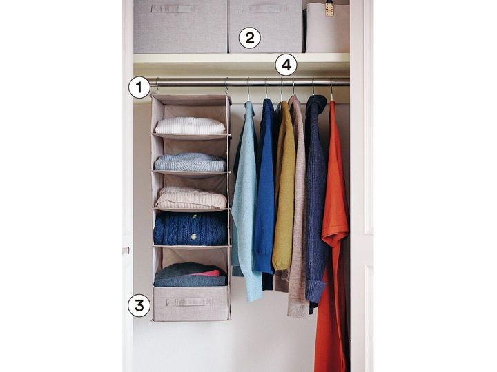 何がどこにあるかひと目で分かるつり収納は、着替え時間の短縮に直結。ハンガーに掛けると伸びやすいニットは、つり収納に畳んでおくのが便利です。引き出しにしまい込むより、見やすくて出し入れもラク!