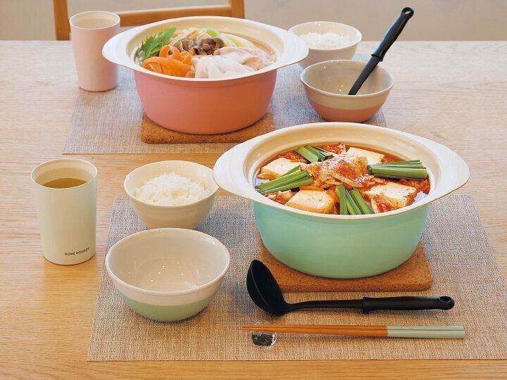 全てトップバリュ ホームコーディの商品。サーモンピンクとミントグリーンの2色展開。20㎝、満水容量3.1ℓ。「深型軽量セラミックコート卓上鍋」各¥3,278、「とんすいボウル」各¥547、「茶碗〈白釉〉大」各¥437、「日本製若狭塗箸 5膳組 パステル」¥1,628、「ミニツールナイロンお玉」各¥217、「ステンレスタンブラー300㎖」各¥1,408