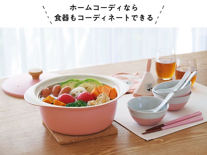 全てトップバリュ ホームコーディの商品。24㎝、満水容量4.65ℓ。「深型軽量セラミックコート卓上鍋」¥3,828、「とんすいボウル」各¥547、「日本製若狭塗箸 彩」¥657、「れんげ 白」各¥437、「タンブラー270㎖」各¥437