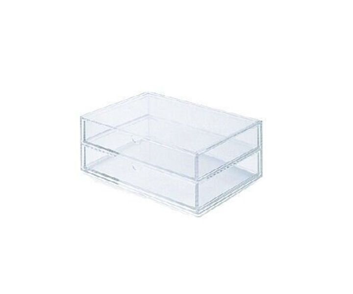 中身が見えるスタンド型と引き出し型のアクリルケース。「ごちゃごちゃしがちなネックレスやピアスなどを美しくシンプルに収納できます。ケースを重ねて使っています」。