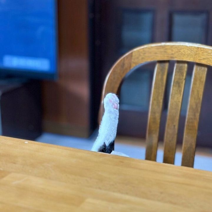 天使こめさん(@0818kome)が投稿したのは、愛猫こめくんとの日常の一コマ。天使こめさんが食事をしていると前の椅子からあるものがニョキッと生えてきたのだそう。その様子に「激カワです」「チンアナゴかな?」などのコメントが寄せられました。