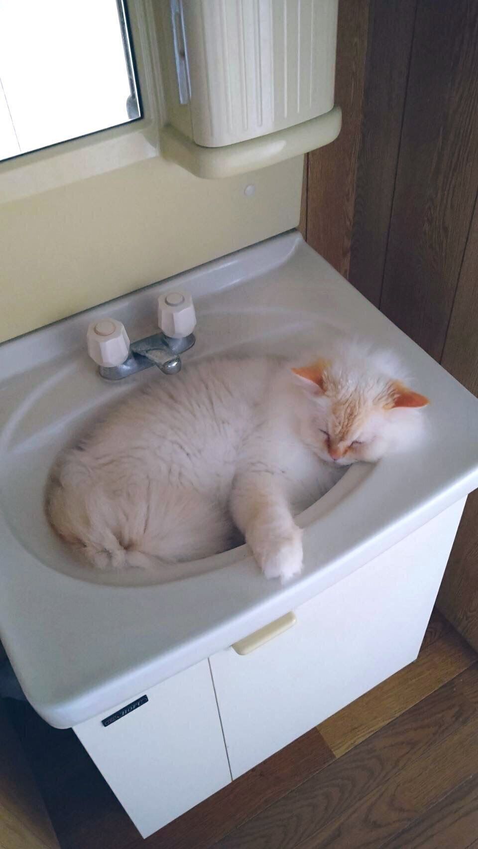 洗面台の水をためておける部分に、体をまるめて収まっていたハクくん。