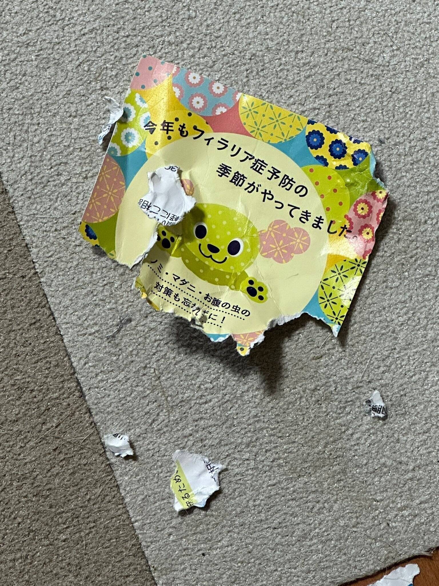 「隣室で仕事をしているさいちゅう、ビリビリと音がしたので様子を見に行ったところ、珊瑚がハガキを破っているのを発見しました。もちろんその場でいたずら自体は叱ったのですが、犬がフィラリアのハガキを破っているという状況が面白かったのでハガキの写真を撮影しました」